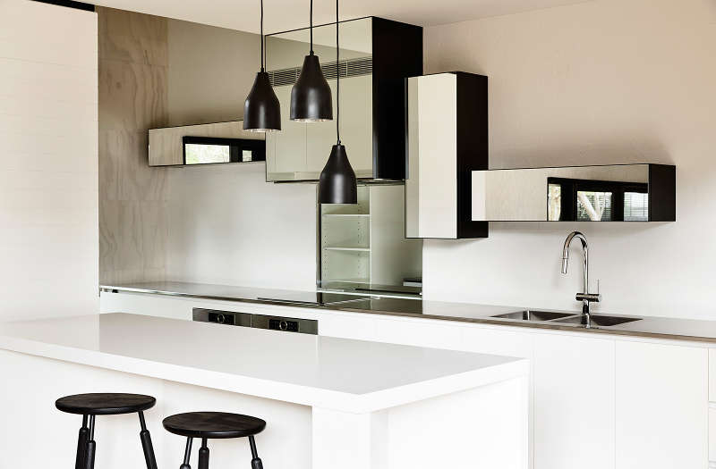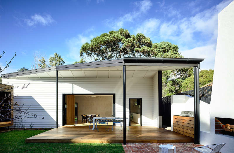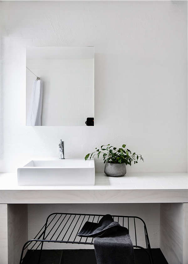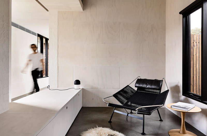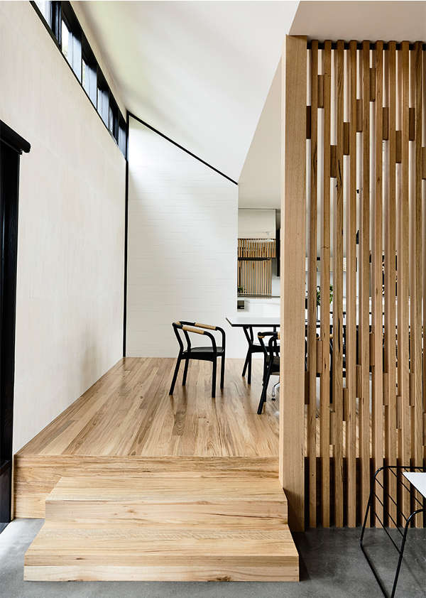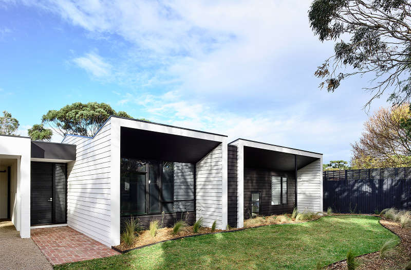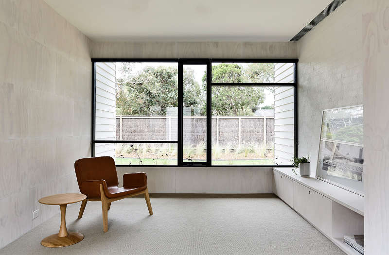This 3 bedroom house in central Flinders in Victoria was designed for a young family by Wolveridge Architects. The simple clean lines of the facade are matched by the interiors where a series of rooms are connected to each other through cut out views and slat screens. Changes of level, up or down a few steps also delineate the simple spaces, while a central courtyard with fireplace provides a sheltered outdoor room. Understated and simply stylish.