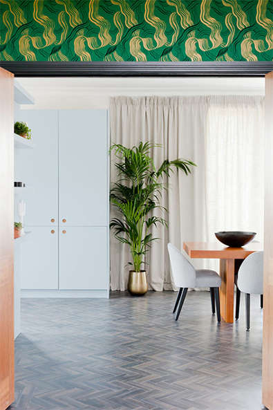 I really love such wide-opened spaces with plenty of light:) And the green wallpaper is absolutely adorable!:)