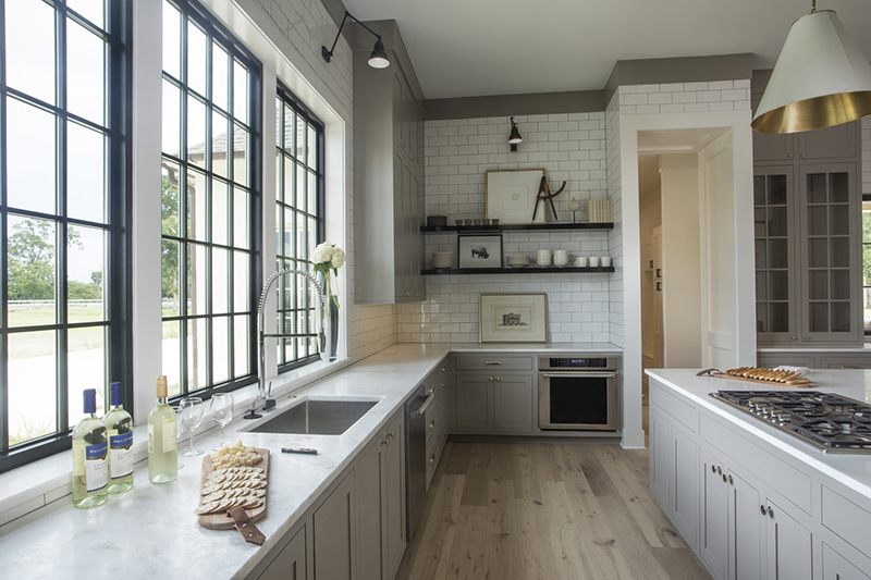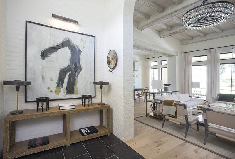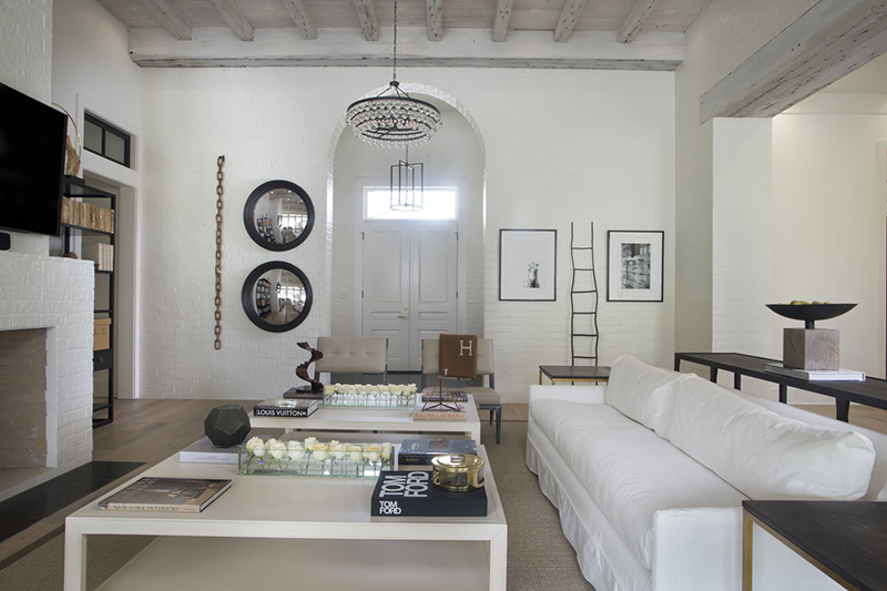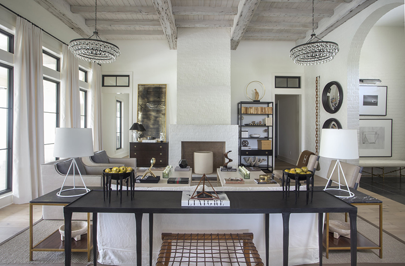 This beautiful home designed by Ty Larkins is glorious in all its shades of white with black and neutral accents. Earthy yet modern. Monastic modern as Ty calls it. The basic DNA of this “Belgium style” embraces spareness and natural light, judiciously excludes superfluous details, but retains the use of honest yet substantial building materials, some re-salvaged, seemingly to provide warmth, age and patina but in the context of a clean, pared down shell, a very careful balancing act to say the least. In an effort to balance our all of the newness of this newly constructed home and suggest patina and history, enormous 200-year old plus re-salvaged beams were installed on the 14′ tall ceilings in the family room and lightly white-washed to slightly modernize their inherent rusticity.