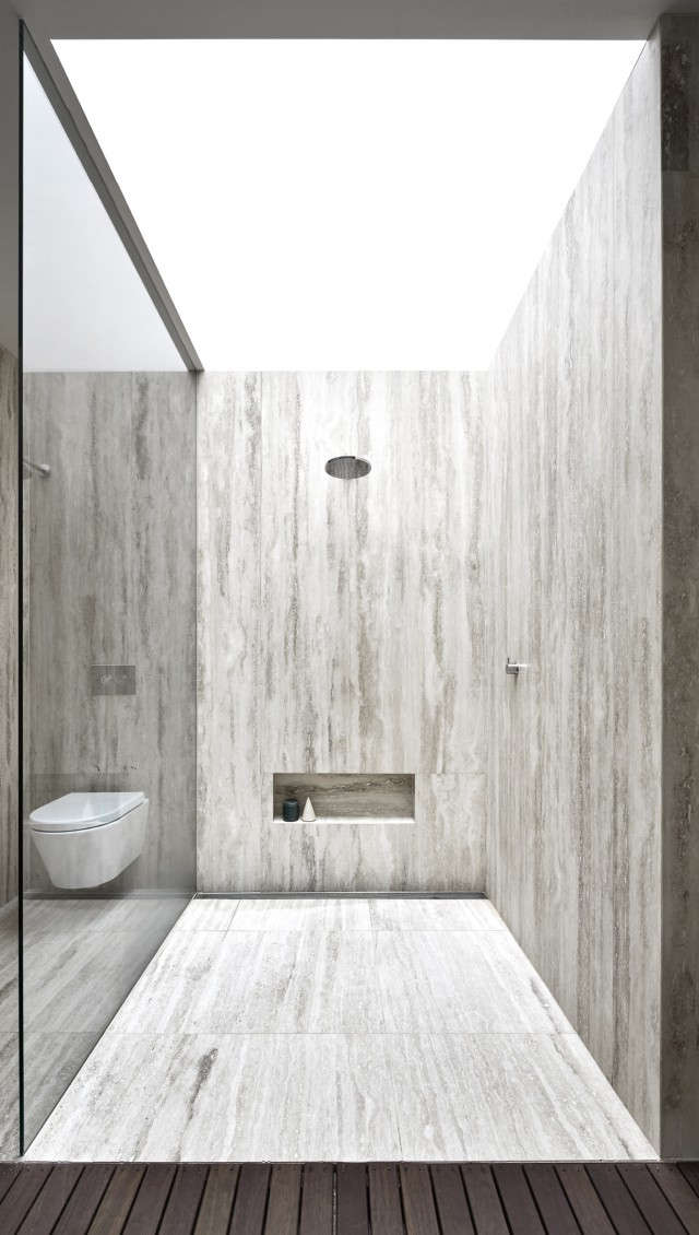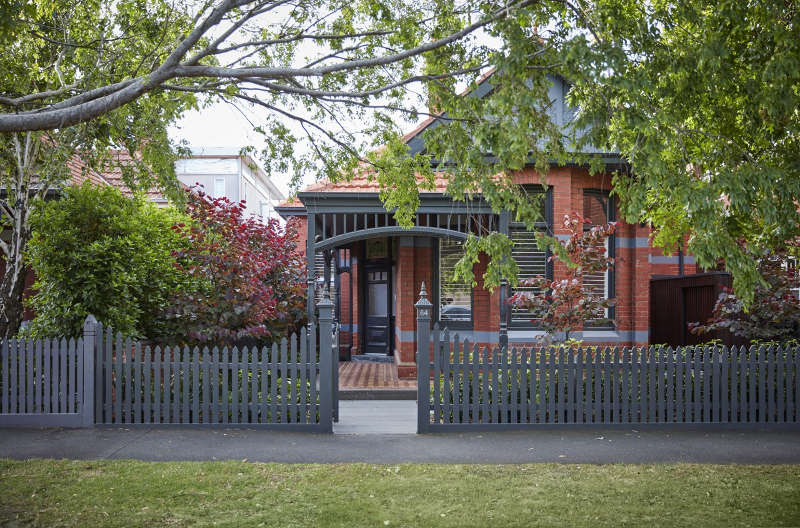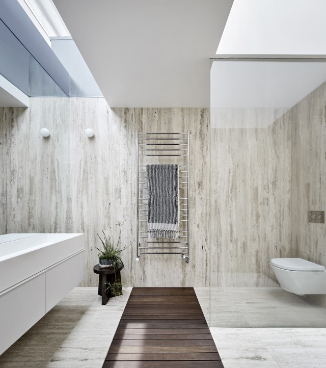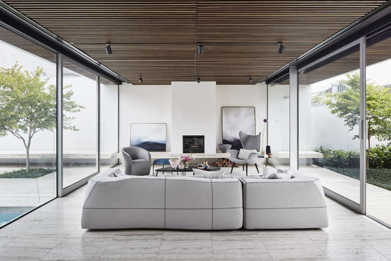 A new extension hidden from the street. Contemporary meets heritage. Walls of glass versus walls of Federation red brick. Inside and out merge while light and cool breezes cross thresholds of sliding glass. Travertine floors and timber slat ceilings. Serene and introspective, the perfect urban oasis. Nolan House by Melbourne-based architectural firm Coy Yiontis.