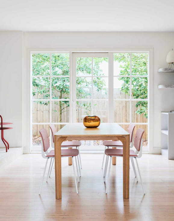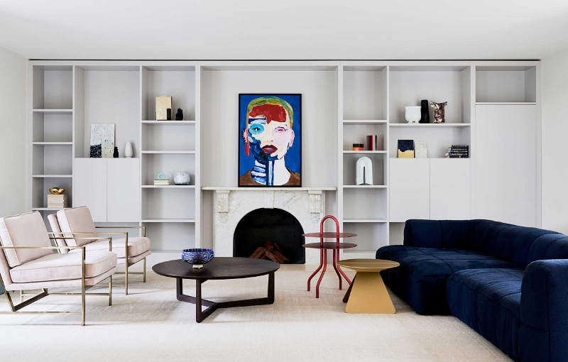 Melbourne-based interior designer Sally Caroline opened up the floorplan and created a sophisticated, contemporary look with statement furniture pieces and a colour palette that references the seaside location with soft neutrals and splashes of blue.