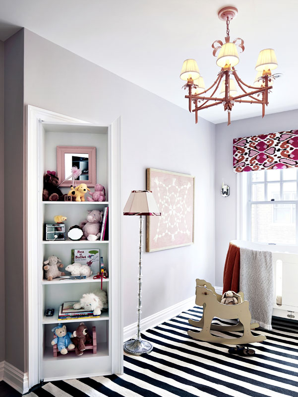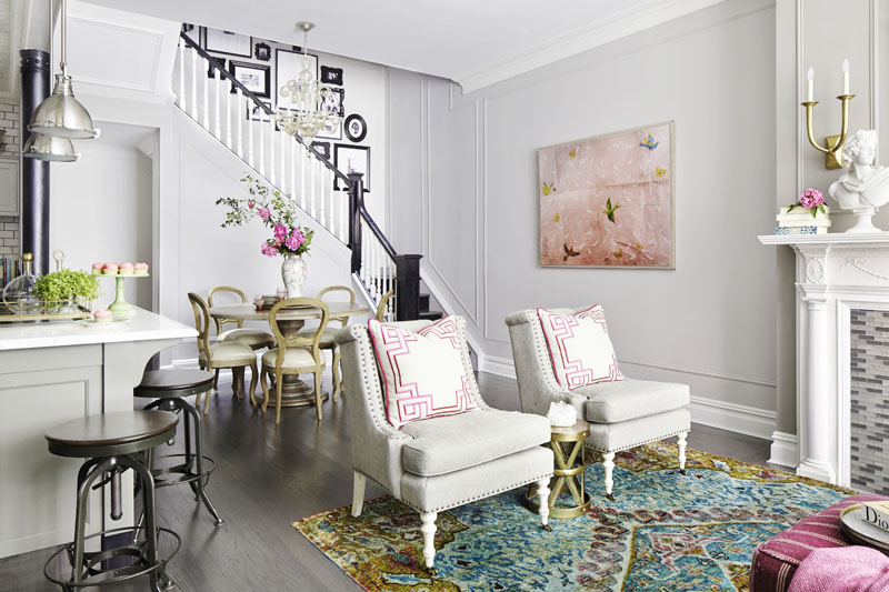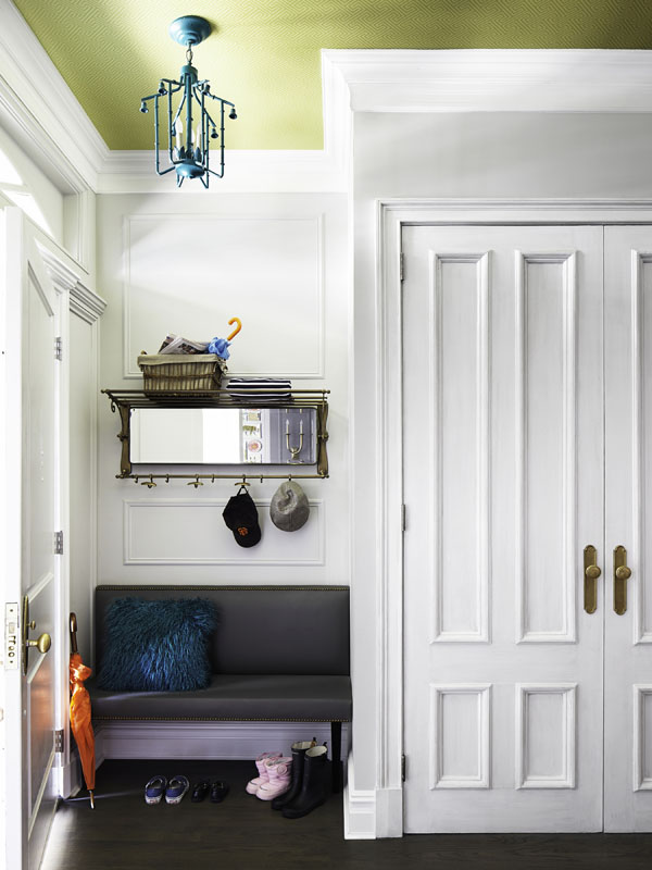 There is nothing I appreciate more than an old home with its original details maintained after a renovation, like in this West Village townhouse by Rob Stuart. This fearless family yearned for a color infused, yet calming, fresh design all with the detail and nuance of a rarified turn of the century townhouse. Vintage mantles, layered moldings, patterned wallpapers and colorful fabrics come together in this family friendly home. We nudged various walls slightly throughout the floor plan to provide for a more spacious feel. I am head over heels with this little foyer in the photo above. I love the bold yellow wallpaper for the ceiling paired with the teal light fixture. It’s an unexpected pairing with the rest of the traditional details.