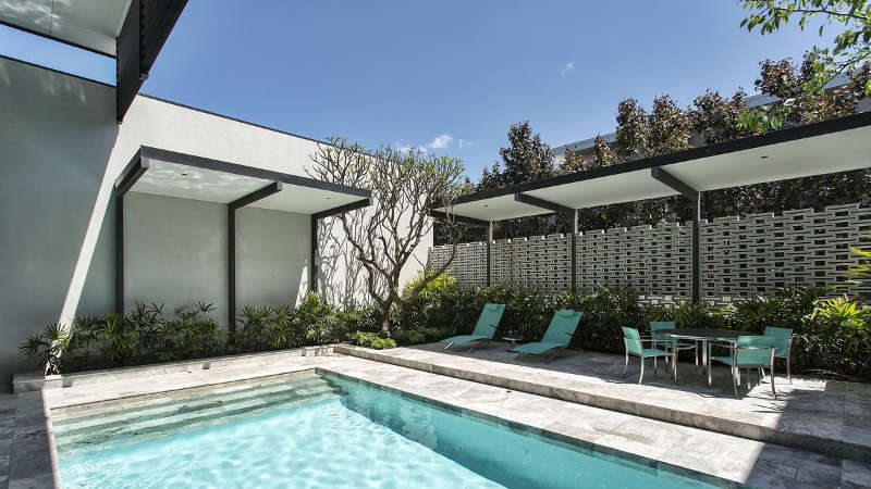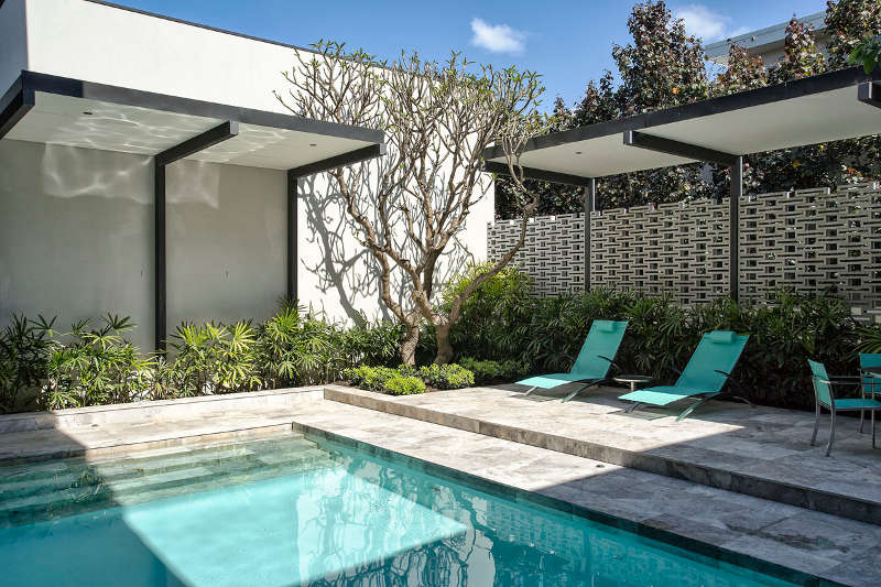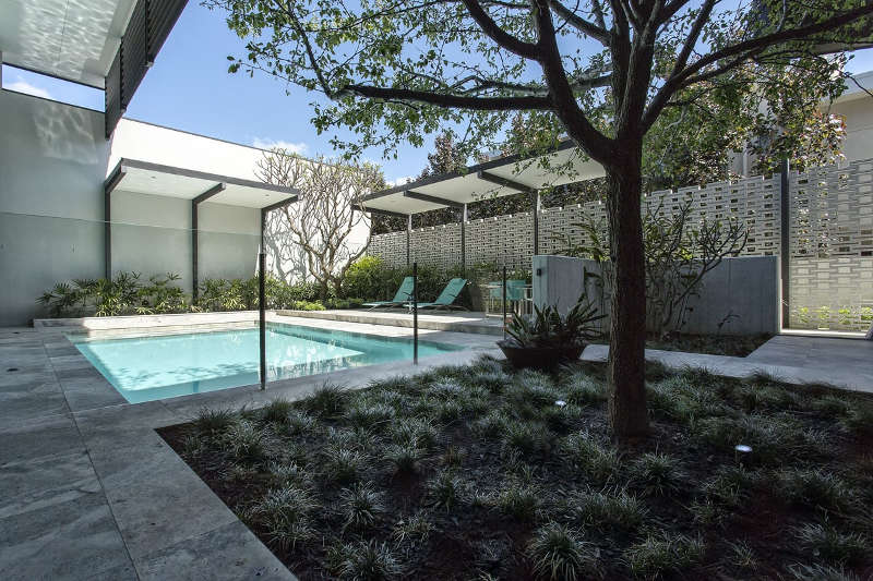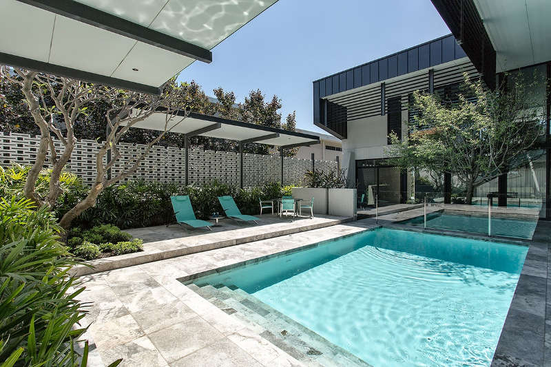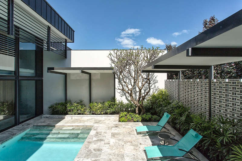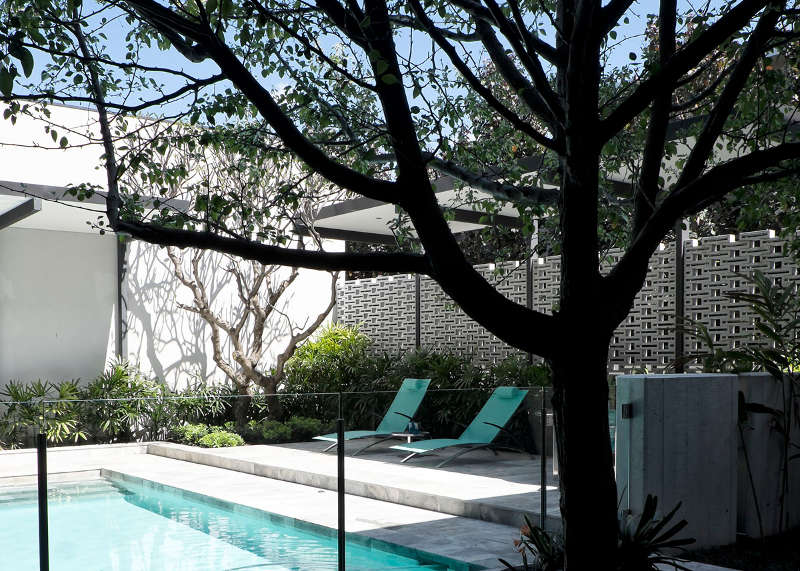 You could be excused for thinking that you had time travelled poolside to 50s Palm Springs – breezeblock walls, long sleek lounges for sunning, architectural plantings, graphic black and white palette with that oasis of blue water screams Mad Men and Sinatra. Except this is Perth in Western Australia and the time is now. Midcentury mod perfection. Applecross residence by Tim Davies Landscaping.