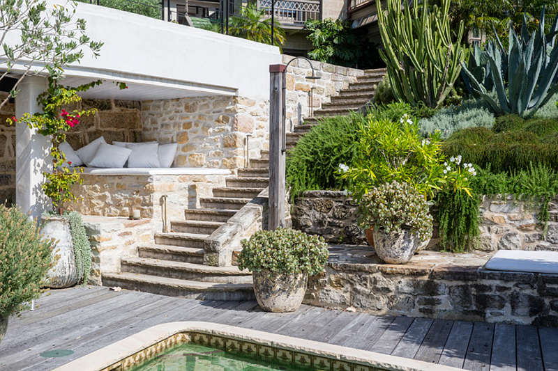 Two grand old homes in Sydney, two gardens full of delight. One, an entertainer’s garden, sits on the harbour’s edge and has an almost Mediterranean feel with stone and whitewash. The other, a green escape, cascades down a steep slope with a hint of mysterious rainforest. Both beautiful, both inspiring, both by Bates Landscapes.