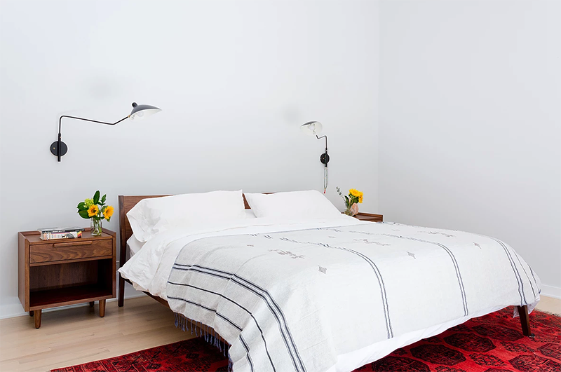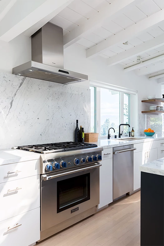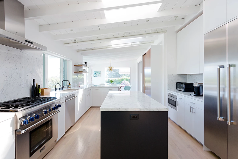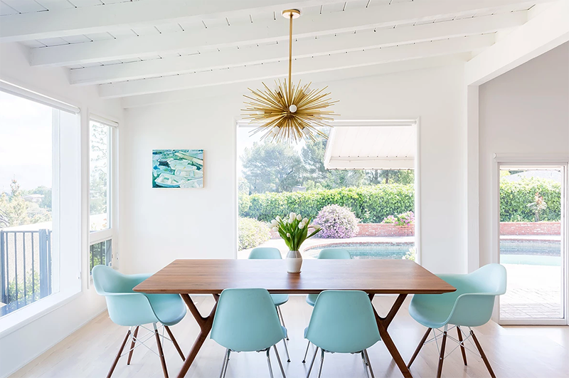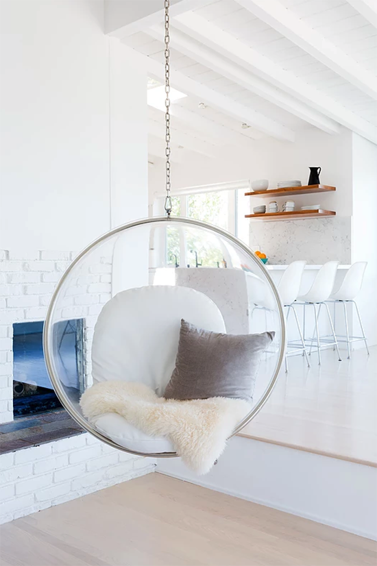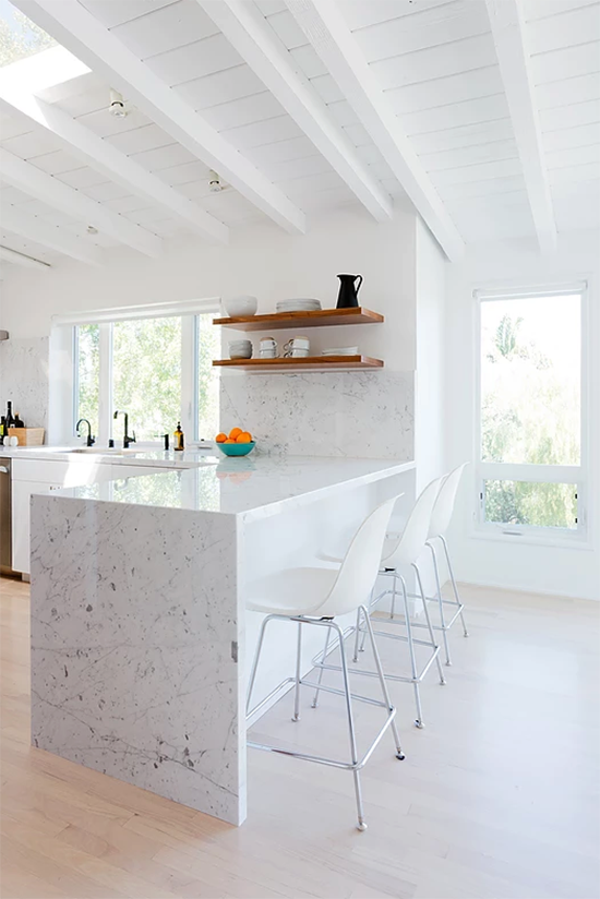 A simple, somewhat minimalist, mid-century renovation in Royal Woods, California by 22 INTERIORS. Super bright and modern, I would have loved to see a bit more colour and “stuff”, and maybe those ceiling beams left unpainted, but the marble and banquette in the kitchen make up for it. 🙂