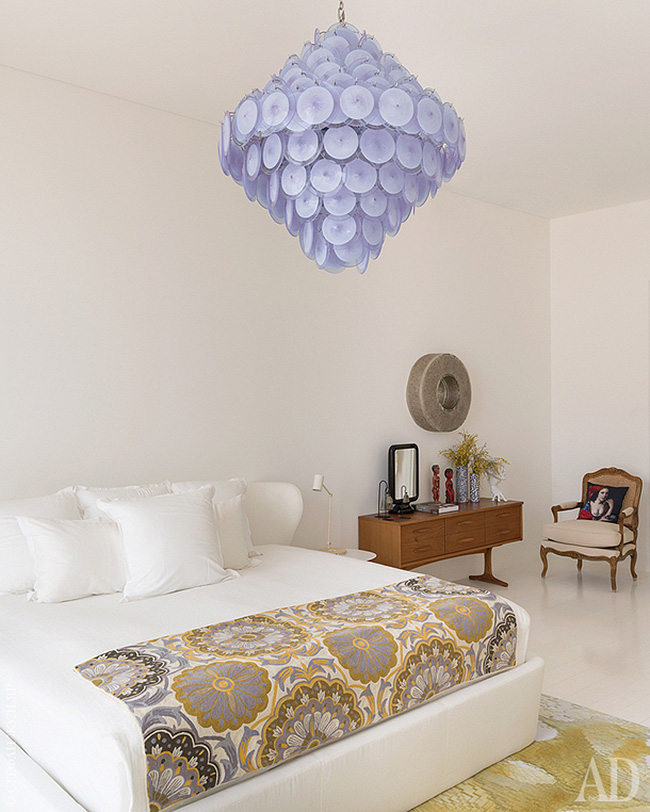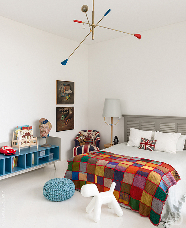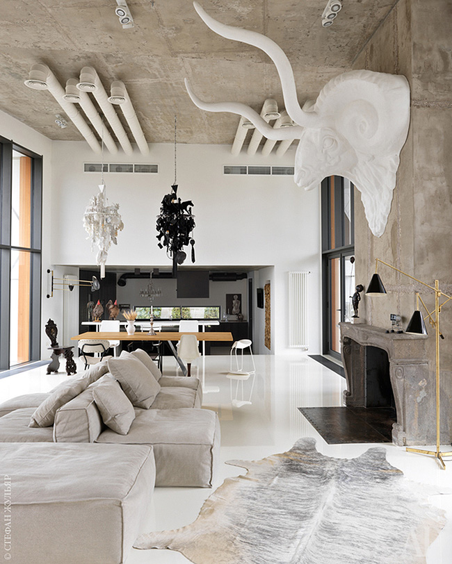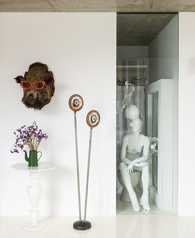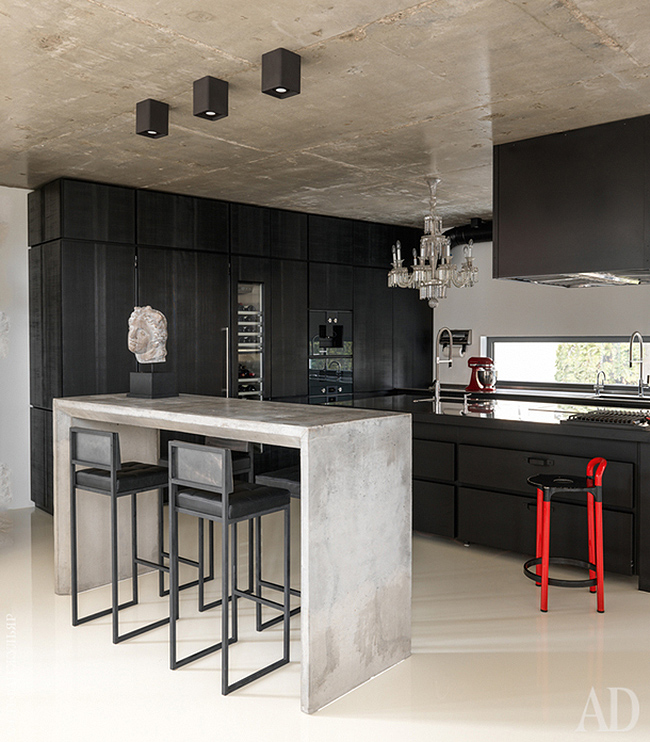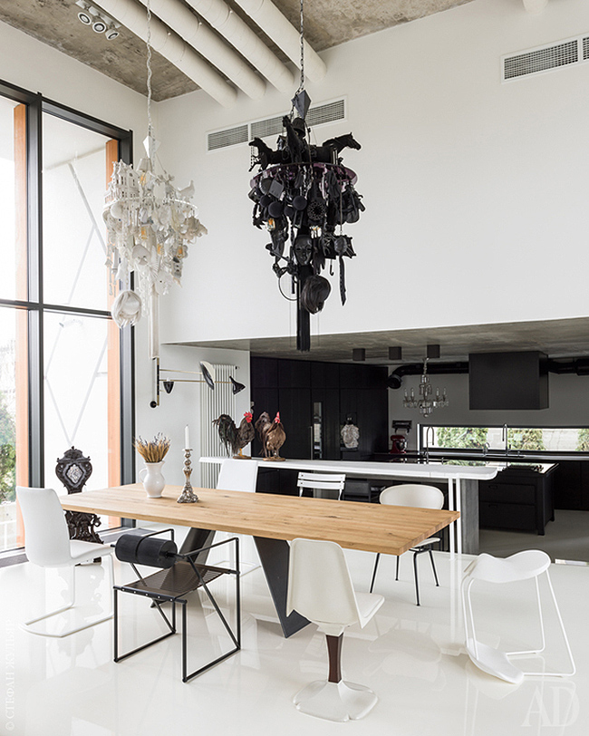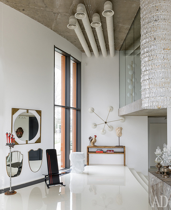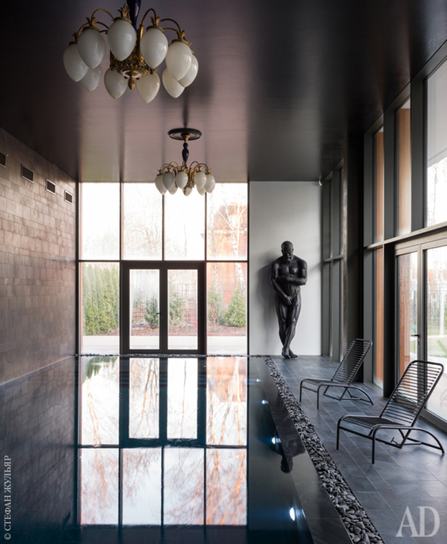 This fabulously eclectic newly-built home filled with art is located in Moscow and was designed by Anna Erman. (Note: there are a couple of dead animals pictured for those who take offence). Lots of quirky art pieces are displayed throughout the home but my favourites are the chandeliers over the dining table (by Winnie Louis). Nothing floats my boat more than statement lighting! The lighting over the pool is also fabulous I must point out. Via Architectural Digest Russia, photos by Stephen Jouillard.