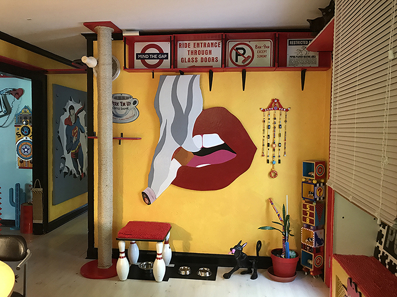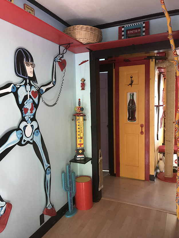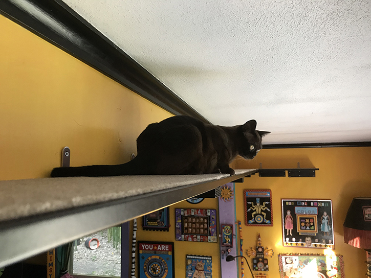 You’re not going to believe this, but I found someone who possibly loves cats more than me!! Or at least spoils their cats more than I spoil mine. My name is S.T.A.R. (Star’s Things Altered and Recycled) A mixed media recycled artist residing in New York which has recently taken a detour into a personal cat adventure of building Cat Walks for some ultimate furry companions, also know as The “Choco-Lettes”. At this point in time there are over one hundred and forty feet of sky highway for these felines to clown around. Hoping to also inspire all cat lovers all around the world. You can see all the madness on my website. OMG my cats would loooooove this!!