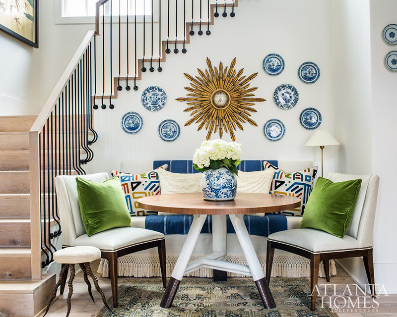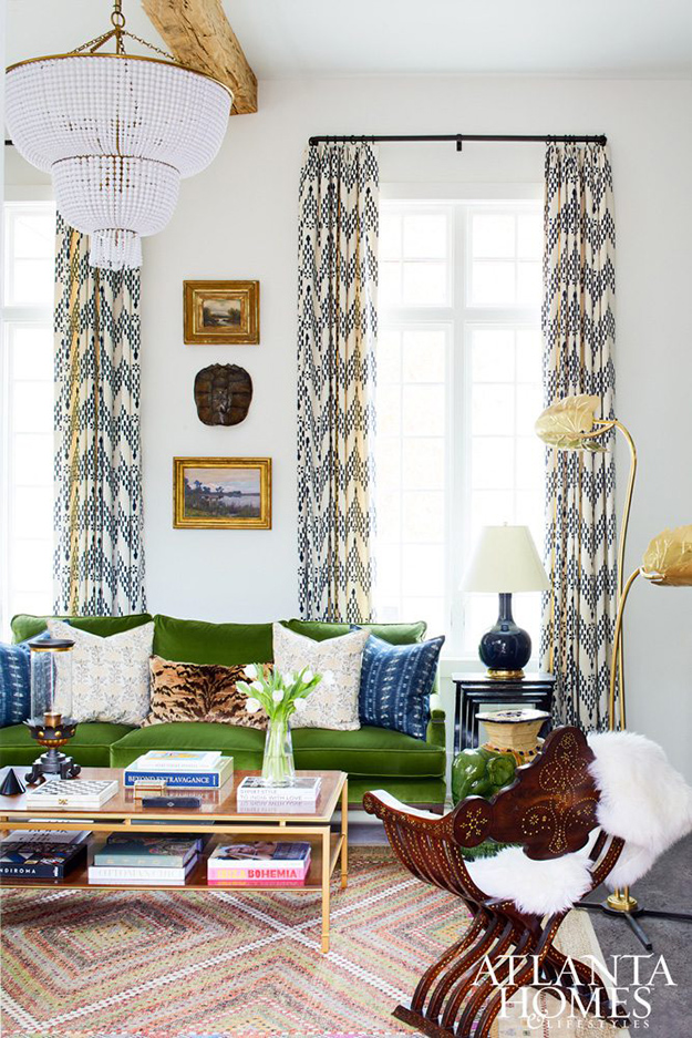 Loving the fresh, vibrant vibe in this living room featured in the 2017 Serenbe Designer Showhouse via Atlanta Homes & Lifestyles. The living room started with the designers’ shared love of textiles and travel, melding global influences. Nina Nash and Don Easterling of Mathews Furniture + Design took cues from Kit Kemp’s bohemian English boutique hotel concepts. “It’s about blending timeless pieces with daredevil design,” Nash says. “We wanted an eclectic rendition of a classic English style.” Easterling was eager to accessorize with his collection of English antiques, including a gilded sunburst clock, framed pastoral paintings and blue-and-white porcelains. The room is defined by its mix of old and new, from the reproduction French Moderne coffee table and faux-palm floor lamp to a colorful antique Turkish kilim and an Indo-British armchair draped with a sumptuous sheepskin. Sister Parish window treatments and indigo Christopher Spitzmiller gourd lamps frame a green velvet sofa, which inspired the abstract commission by Nashville artist Kayce Hughes. The bold fabric reappears on pillows in the dining nook, where a fringed Oscar de la Renta settee (topped with an indigo Bunny Williams Home throw) sidles up to custom Hickory Chair table with metal-wrapped legs.