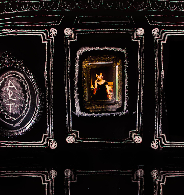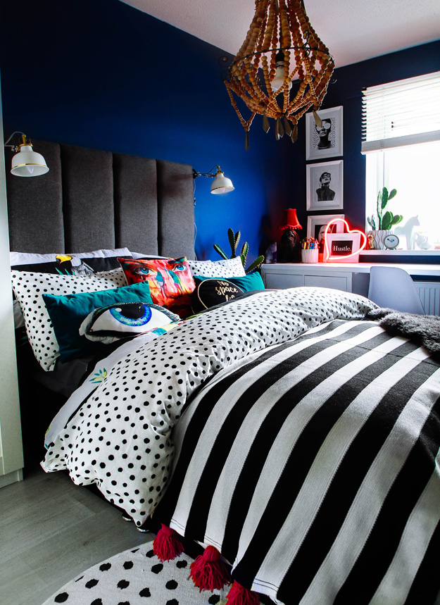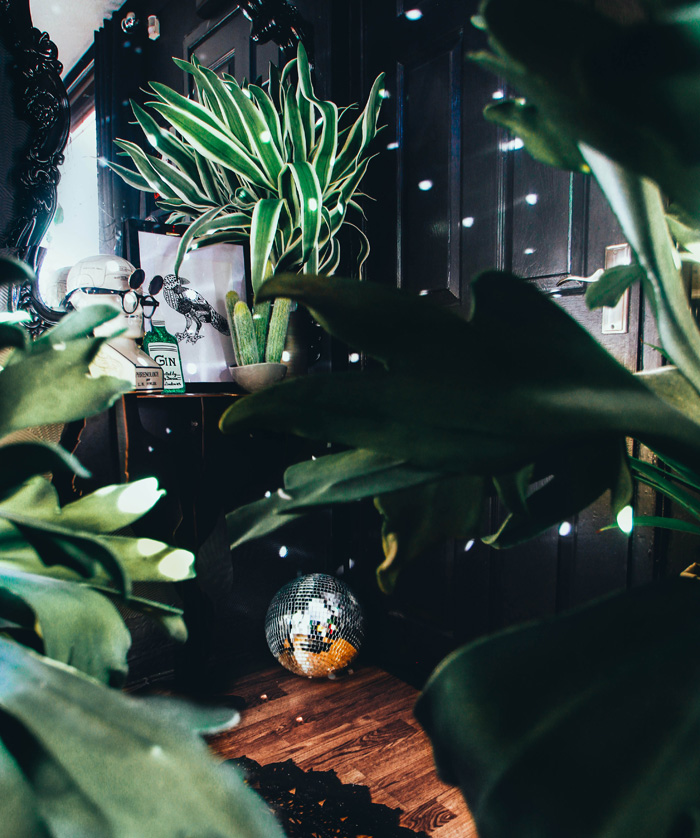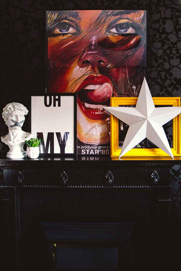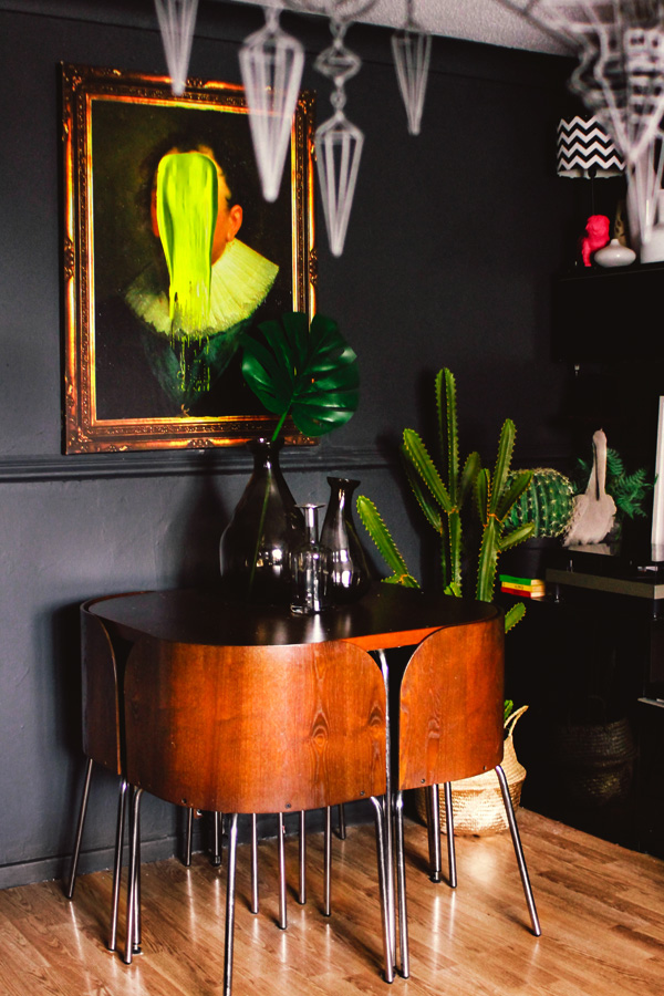 I wanted to share another home with you today that I fell in love with on Instagram. A while back I met Pati Robins virtually through this awesome social media outlet and her and her home have become instant favourites. Let me tell you a bit about Pati before I take you further into her home, but as you can see from the photo above of her entryway, Pati’s joie de vivre and bold style is immediately apparent. Pati is a Polish chick who moved to the U.K. in 2007. She rents a small 2 bedroom, disabled-adapted home that is 59.8 square meters and shares it with her disabled veteran husband, daughter Olivia and 2 dogs. When they moved in to this home it looked NOTHING like this. It was painted in magnolia with smelly smoke-stained walls and a sloping mud patch of a backyard…clearly she has free reign from her landlord when it comes to painting her home. WOHOO! Over the past 10 years Pati has slowly renovated and decorated her home herself on an almost non-existent budget (having only paid a plumber once to install a radiator). She’s so damn crafty that she even dyed a leather chair black! (see 3rd photo below) Oh, and did I mention she’s a fabulous photographer??? This girl is so freaking talented!! And sweet! I just love her to bits and am so stoked that she was eager and willing to let me share her home here on the blog, which she has been reading for years! Mutual love fest happening here folks. Anyway, may I introduce you to Pati’s dark and maximalist mini-home! *insert black hearts here*