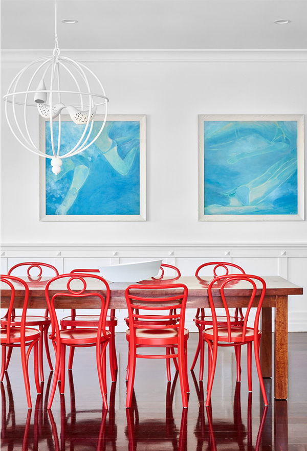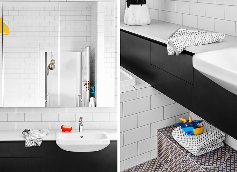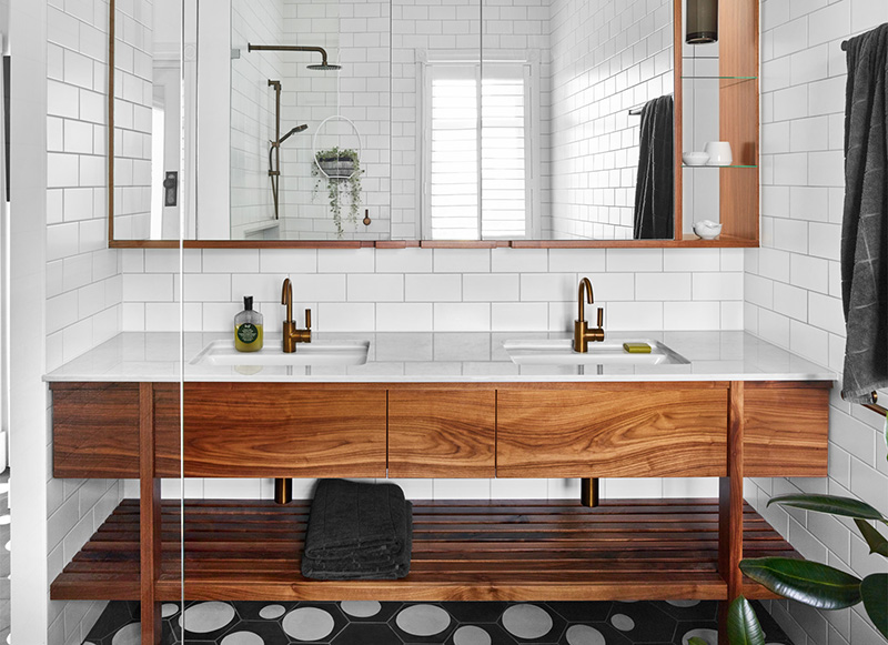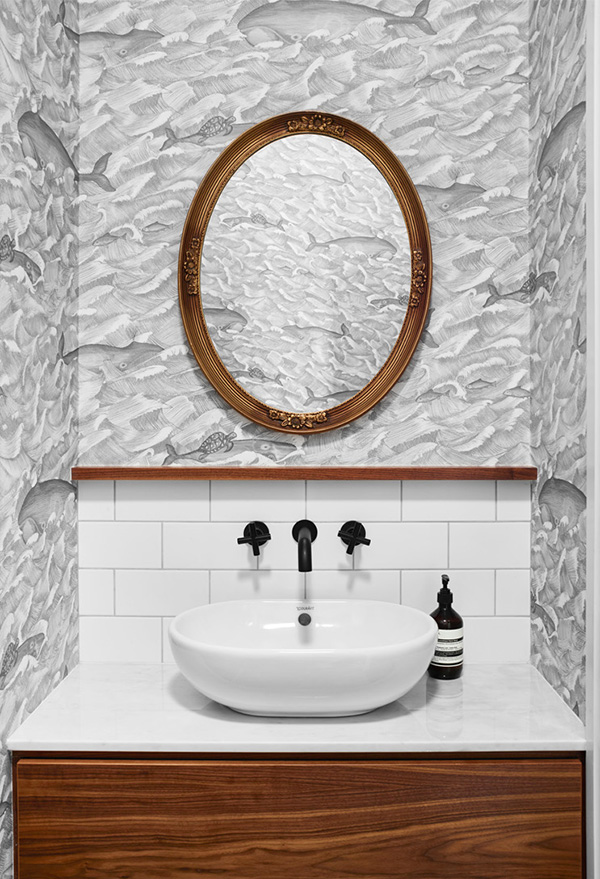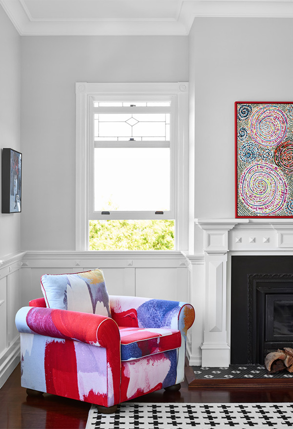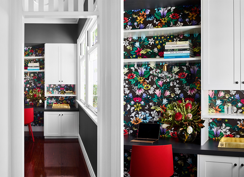 Making a bold statement in this gorgeous home in Paddington, Queensland designed by Claire Stevens. Opening the kitchen and living areas to the panoramic city view and recently landscaped garden, as well as reconfiguring circulation paths, increasing room size and maximising storage, were all significant aspects of transforming this recently built reproduction country cottage into an open plan home for a young family. Bespoke joinery is punctuated with a graphic black and white materials palette with walnut, brass and leather detailing adding a subtle sophistication to each space. The client’s eclectic style and affinity for colour and pattern is reflected in the wall and window coverings, light fittings, artwork and furnishings. The result is a home that is a playful juxtaposition between modern and traditional, colour and monochromatic, bold graphic patterns and delicate floral designs. Photos: Toby Scott. Styling: Lynda Evans