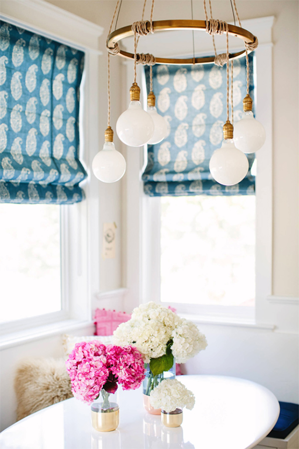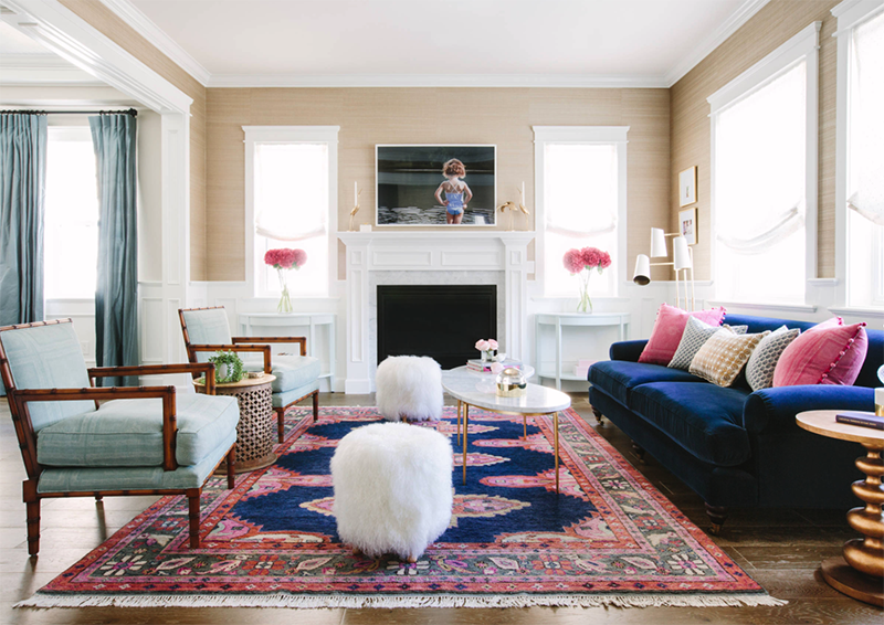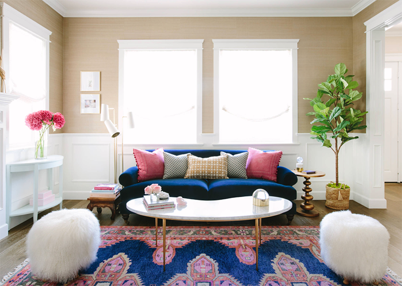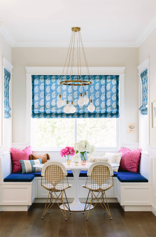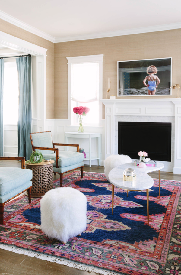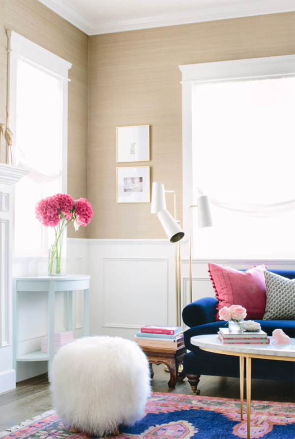 A dose of earthy glamour to finish off the day. One of these days I need to try a grasscloth wallpaper – it adds so much warmth and texture to a space. Beautiful mix of blue and pink in this living and dining rooms in Sherman Oaks, CA by Jessica of Glamour Nest