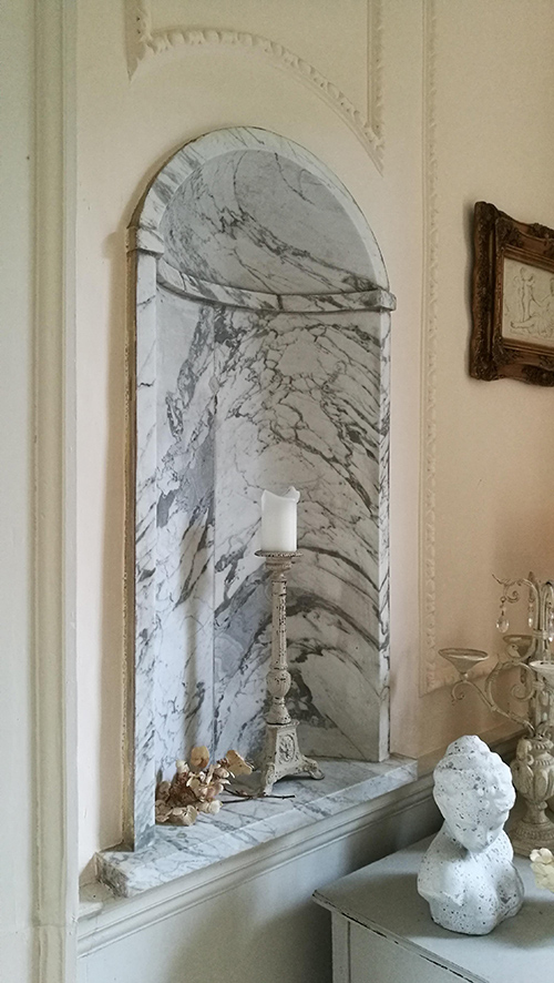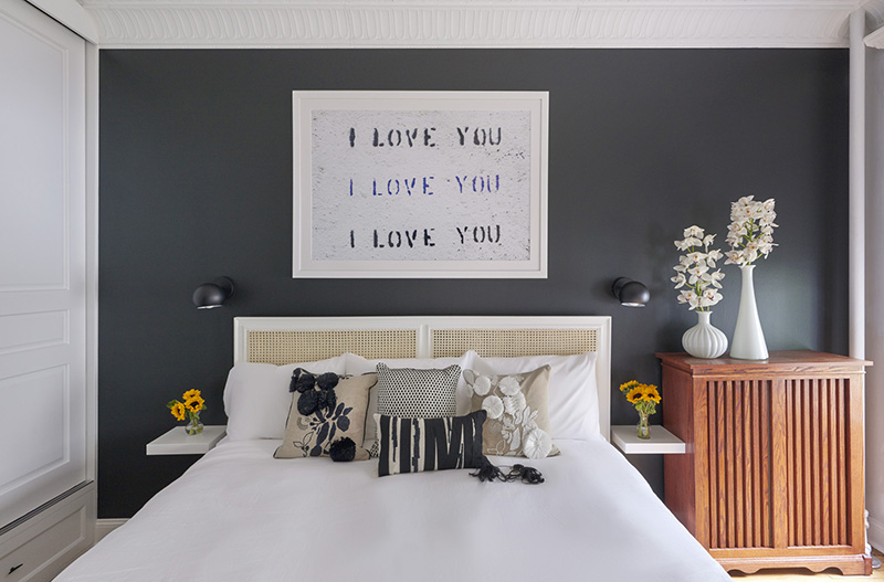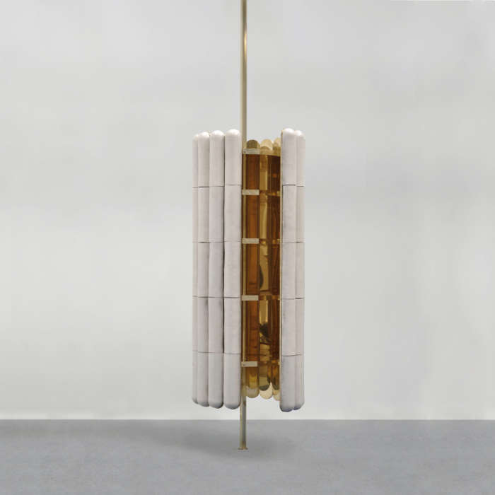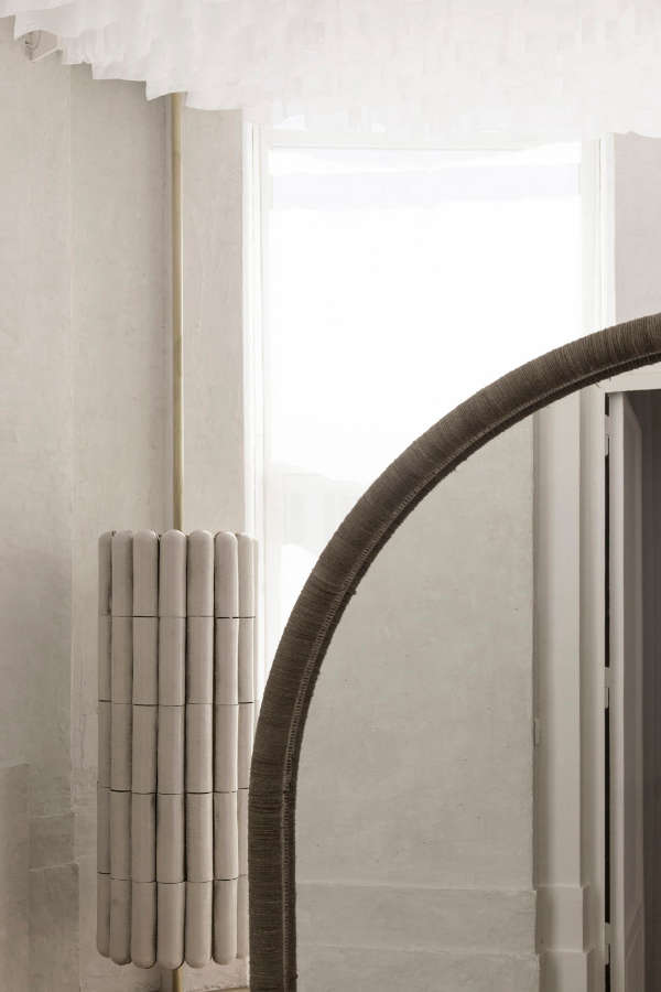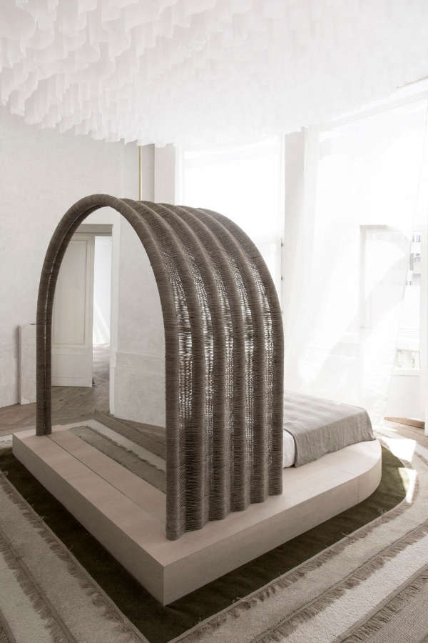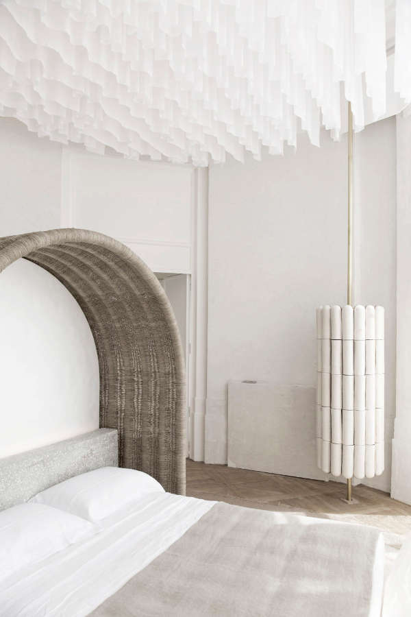 I much as I’d love to reproduce this amazing bed canopy by interior designer Emmanuelle Simon I don’t think I would have the talent or patience. It’s a striking centrepiece for this zen-like bedroom. That is until you look up and see the cloud of floating drapes above or across the room to another of Simon’s creations, the Rakù-Yaki Cabinet. Whereas the bed canopy is earthy and grounding the ceramic encased cabinet is a hidden treasure, opening to reveal its golden (brass) centre. Bedroom as sculpture. Bedroom as theatre. Bedroom as dream space for dreaming.