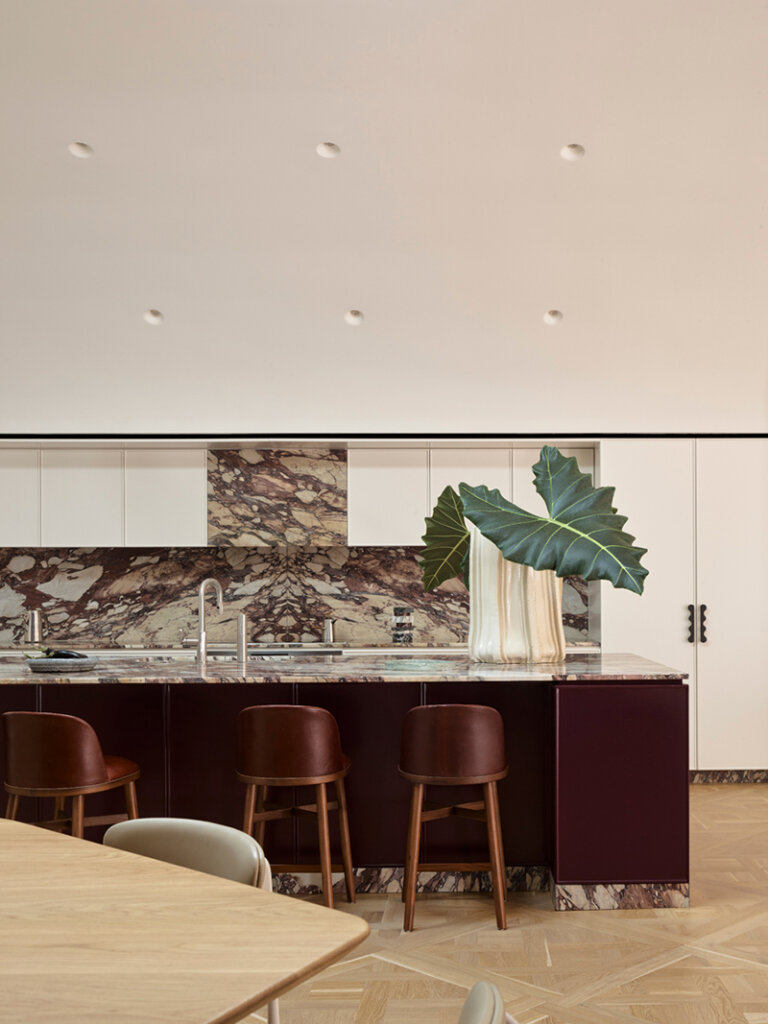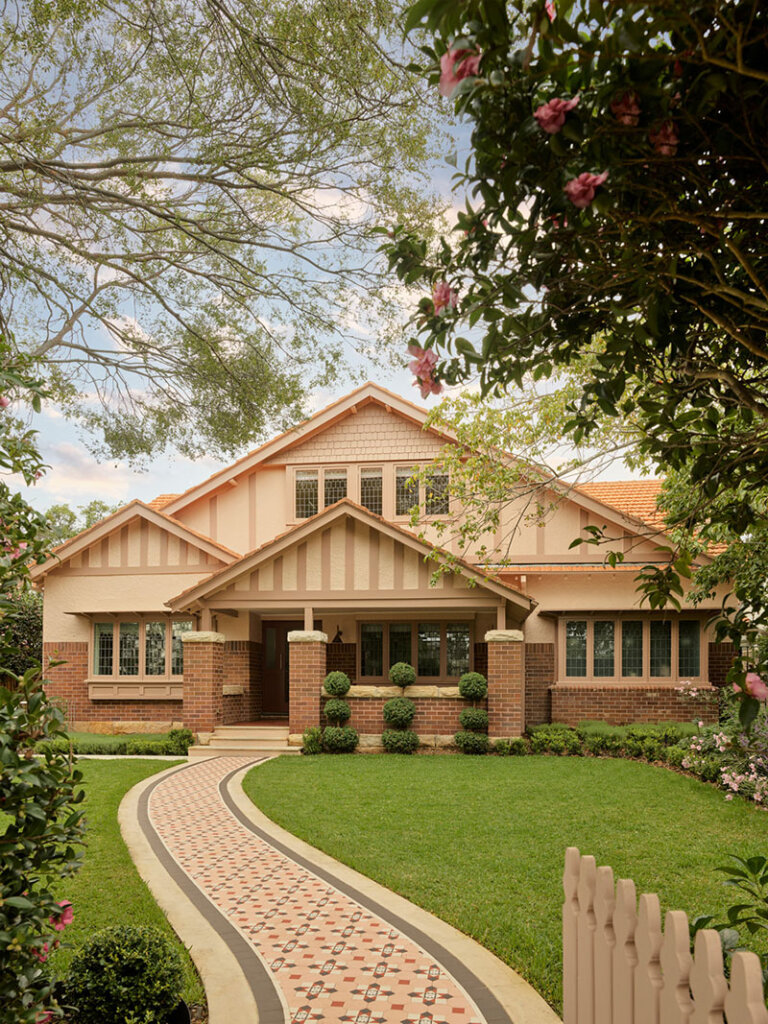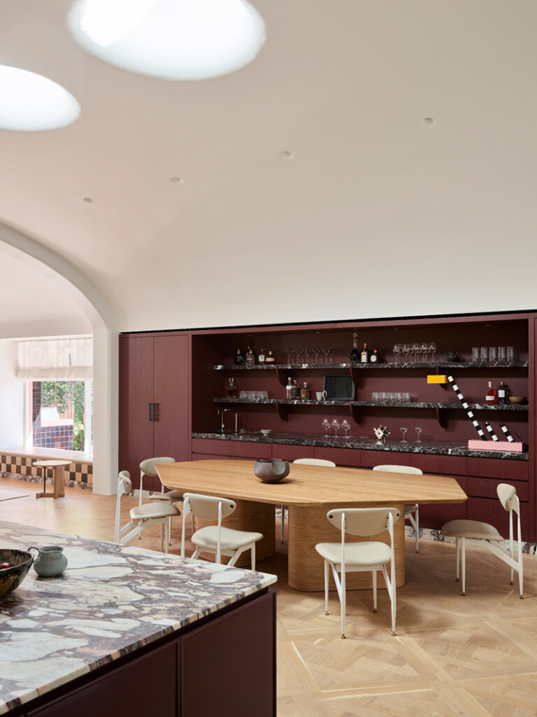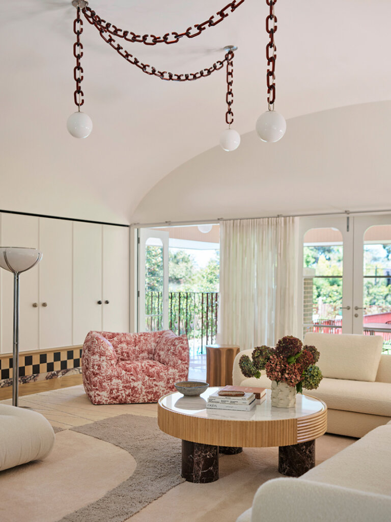Eclectic Mediterranean meets Postmodern charm in this expressive forever home for a family of six in Gordon, a suburb on Sydney’s leafy North Shore. Set on a generous block with a tennis court and swimming pool, the two-storey Federation residence built in 1918 — now complete with a brand-new rear extension — has been transformed by Greg Natale into a charming collision of colour, character, and considered design. From citrus-banded ceilings to graphic chandeliers, Greg celebrates the joy of decoration while staying grounded in thoughtful craftsmanship. Traditional elements such as parquetry flooring, fluted wall panelling, and custom mouldings are reimagined through witty, contemporary interventions. Checkerboard zellige tiles, richly veined marbles, terrazzo flooring, and sculptural joinery introduce layers of contrast and depth, lending the home its eclectic edge. The palette moves confidently between soft European neutrals and irreverent jolts of red, chartreuse, and cerulean, expressed through nuanced gestures like red wine joinery and playful Murano glass chandeliers. Postmodern silhouettes appear throughout, from the angular Cassina console in the entryway to the round-footed tub in the primary ensuite.