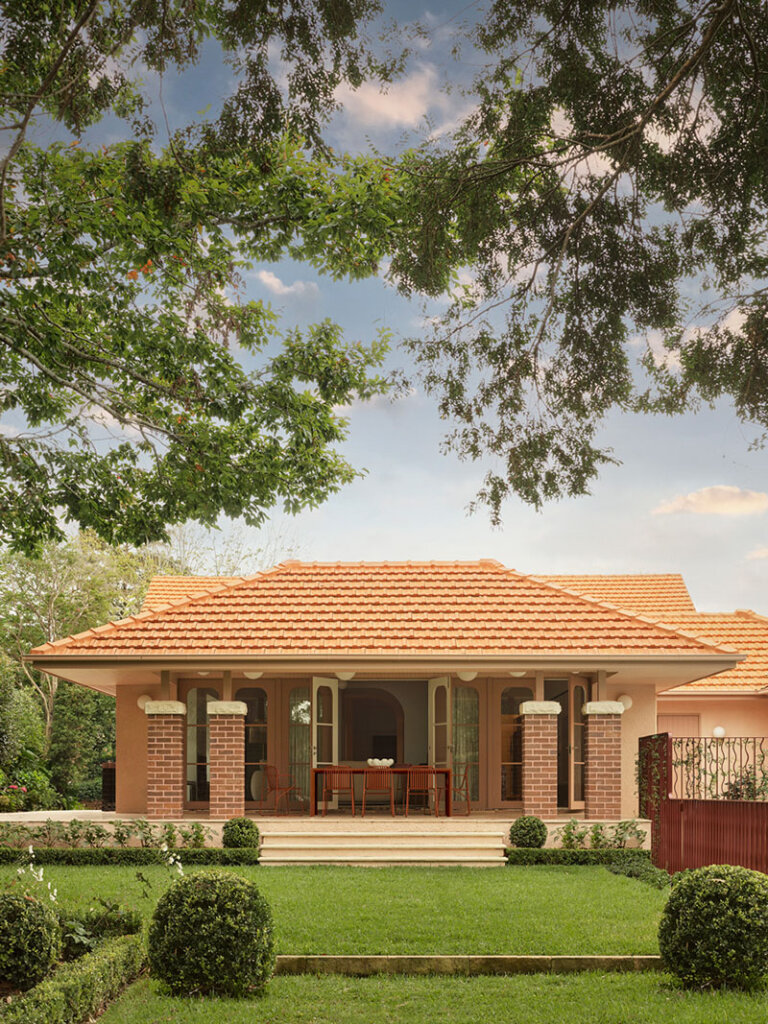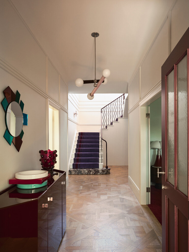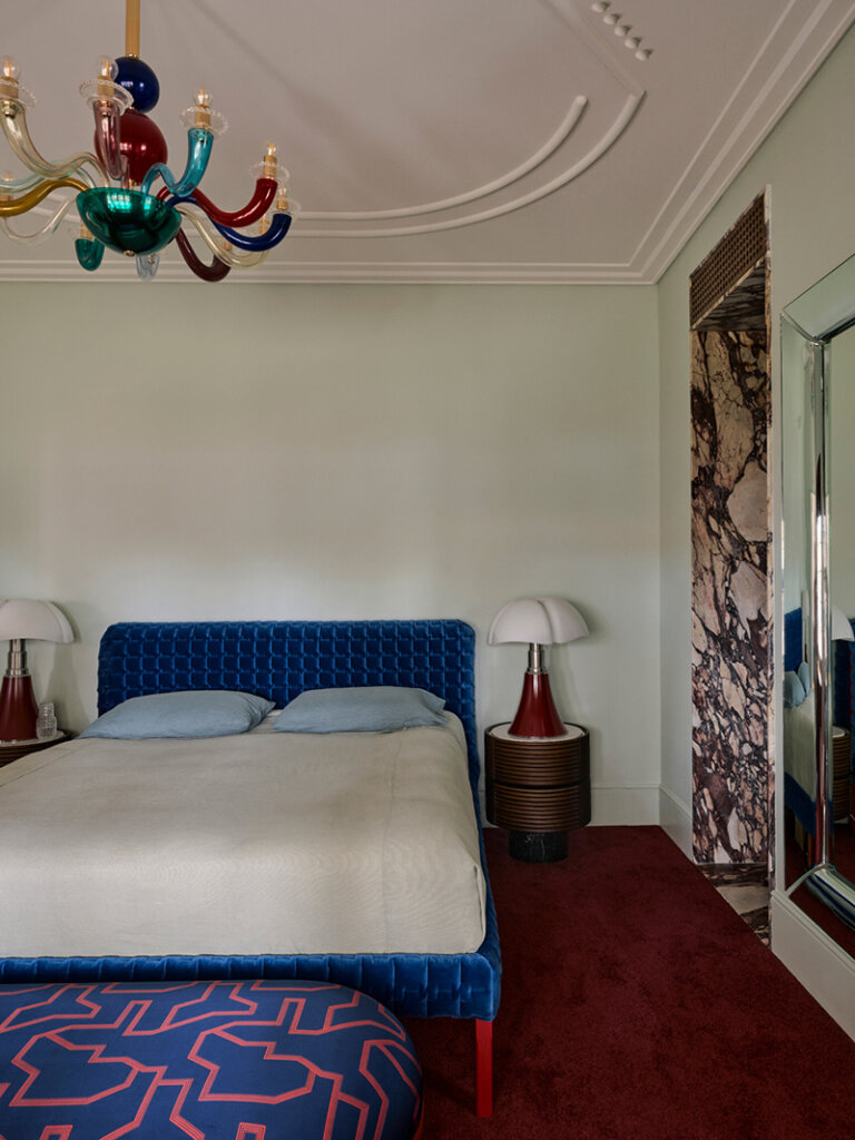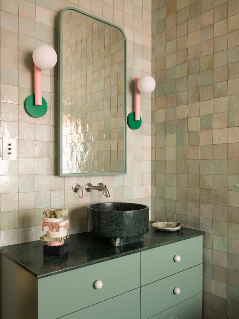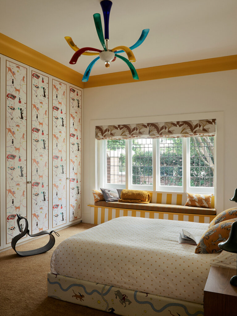 Eclectic Mediterranean meets Postmodern charm in this expressive forever home for a family of six in Gordon, a suburb on Sydney’s leafy North Shore. Set on a generous block with a tennis court and swimming pool, the two-storey Federation residence built in 1918 — now complete with a brand-new rear extension — has been transformed by Greg Natale into a charming collision of colour, character, and considered design. From citrus-banded ceilings to graphic chandeliers, Greg celebrates the joy of decoration while staying grounded in thoughtful craftsmanship. Traditional elements such as parquetry flooring, fluted wall panelling, and custom mouldings are reimagined through witty, contemporary interventions. Checkerboard zellige tiles, richly veined marbles, terrazzo flooring, and sculptural joinery introduce layers of contrast and depth, lending the home its eclectic edge. The palette moves confidently between soft European neutrals and irreverent jolts of red, chartreuse, and cerulean, expressed through nuanced gestures like red wine joinery and playful Murano glass chandeliers. Postmodern silhouettes appear throughout, from the angular Cassina console in the entryway to the round-footed tub in the primary ensuite.