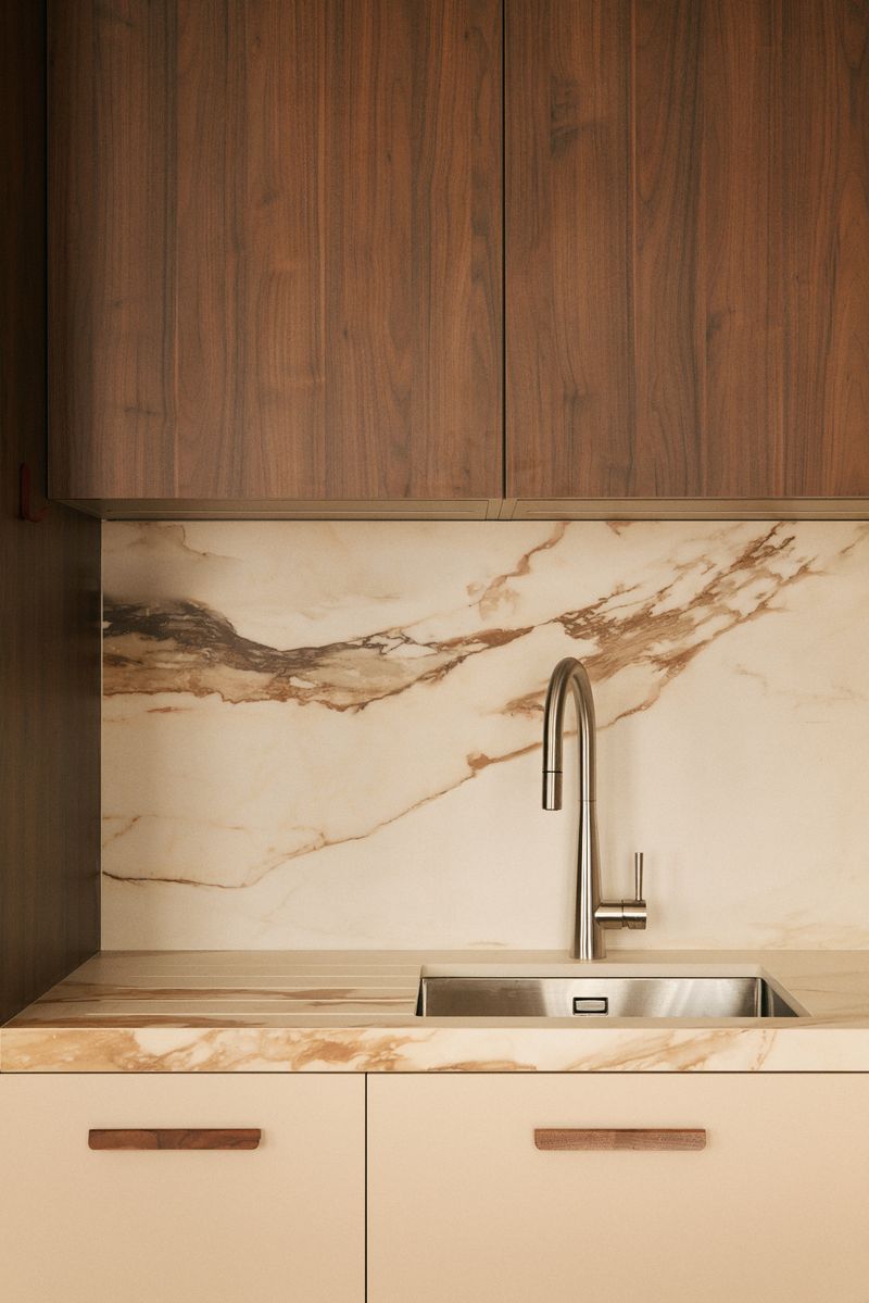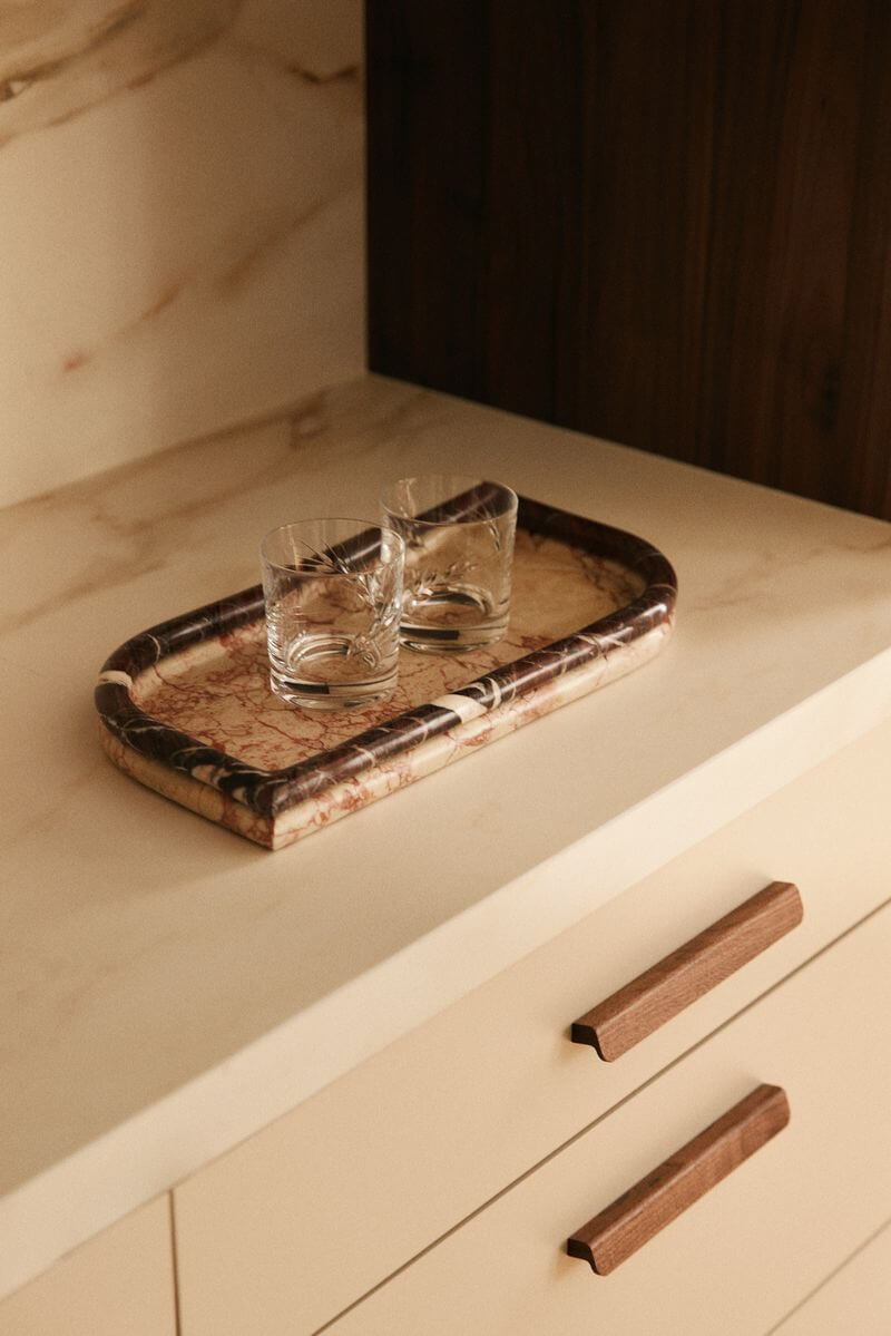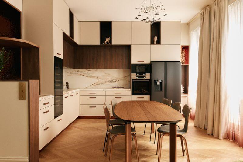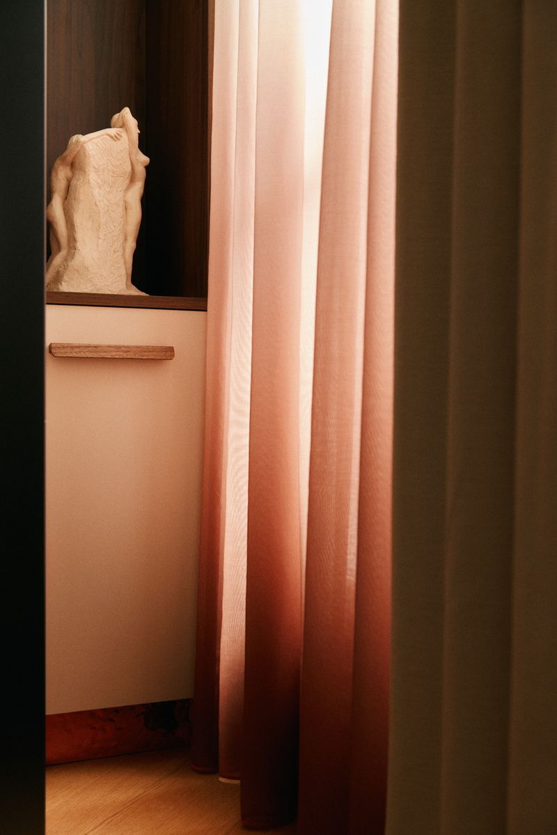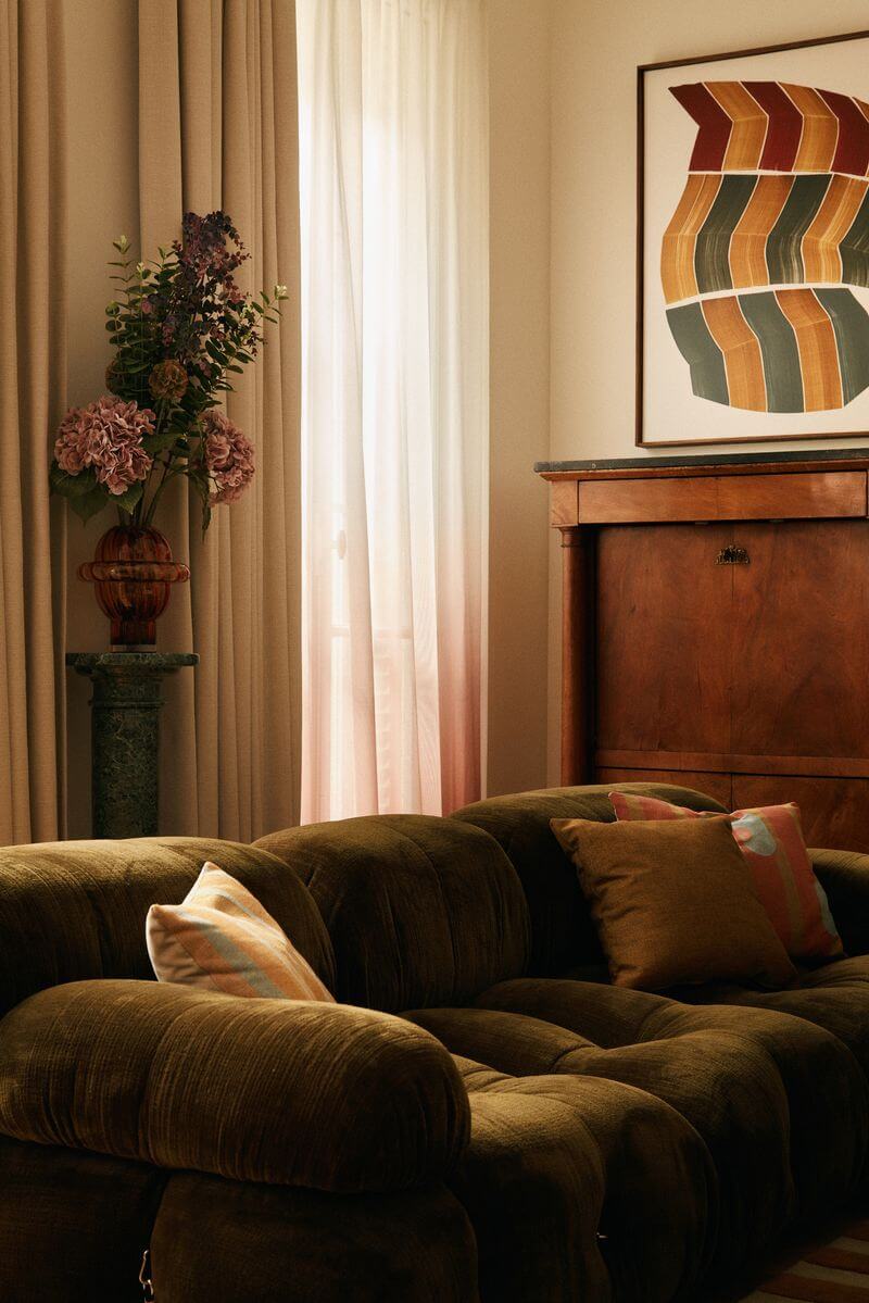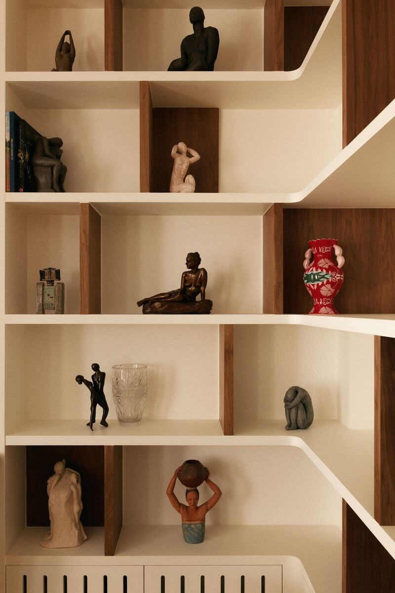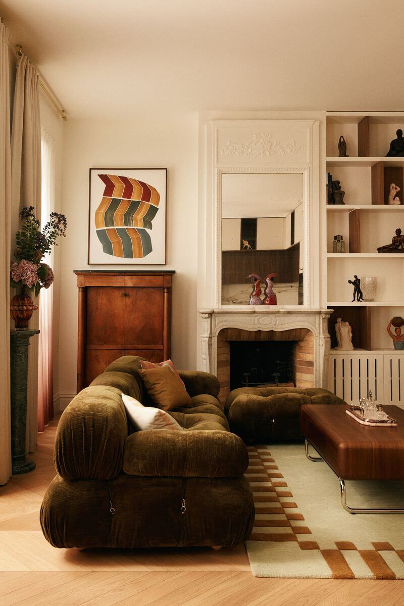 Projet Galliera is a refined renovation of a 95m² apartment in Paris’s 16th arrondissement by Kuentz Le Gall. The design merges heritage and modern craftsmanship through the use of travertine, zellige, and cement tiles, creating a dialogue between texture and light. Bespoke joinery integrates sculptural elements, while a green Camaleonda sofa anchors the living space. The result is a balanced composition of colour, material and form. An elegant interplay between artistic legacy and contemporary design.