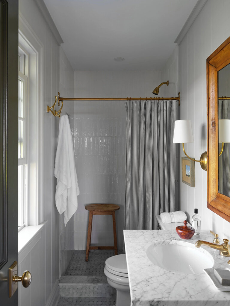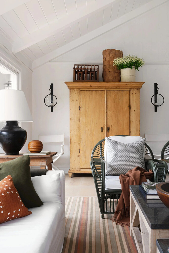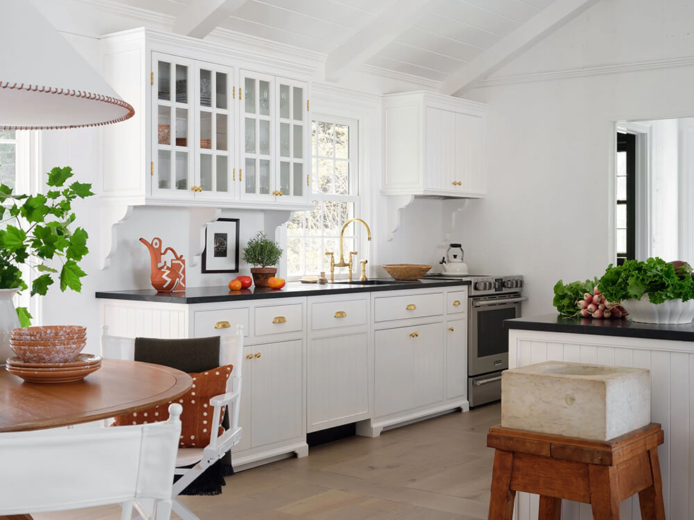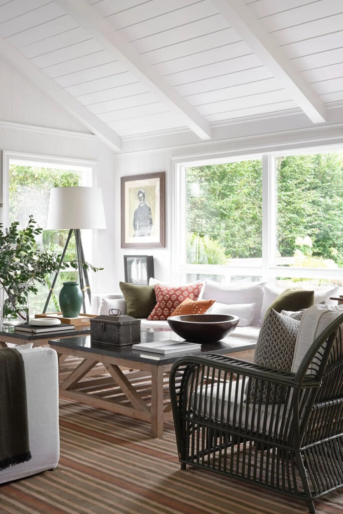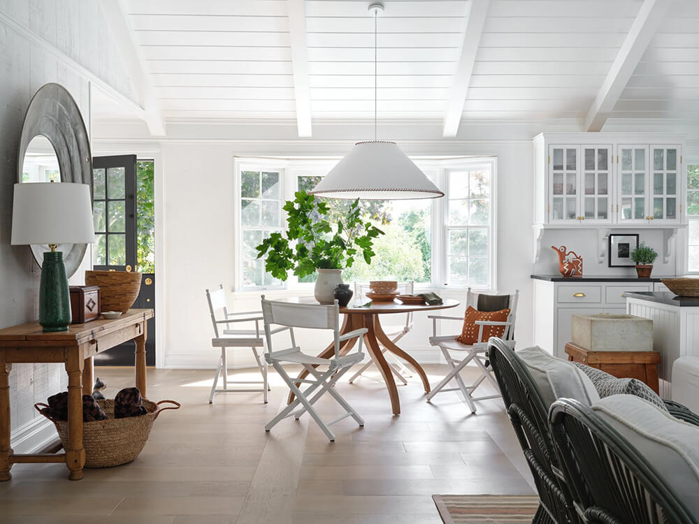 At only 1500 sq ft, this 1960s ranch house in on the North Fork of Long Island seems much larger with it’s white painted walls and ceilings (vaulter ceilings sure help), the addition of a screened porch that feels like an extension of the living room and a new window in the kitchen. Some casual furnishings (in a high-low mix) in shades of white, dark and wood make this weekend retreat an absolute delight for designer and homeowner Dan Mazzarini of BHDM. Photos: Reid Rolls.