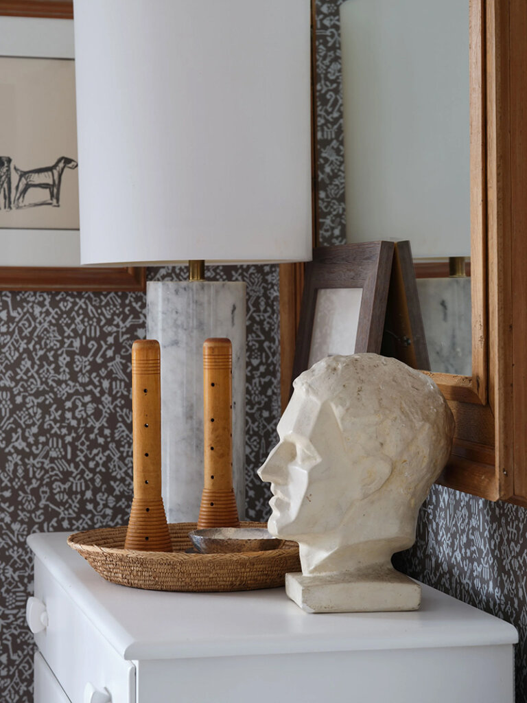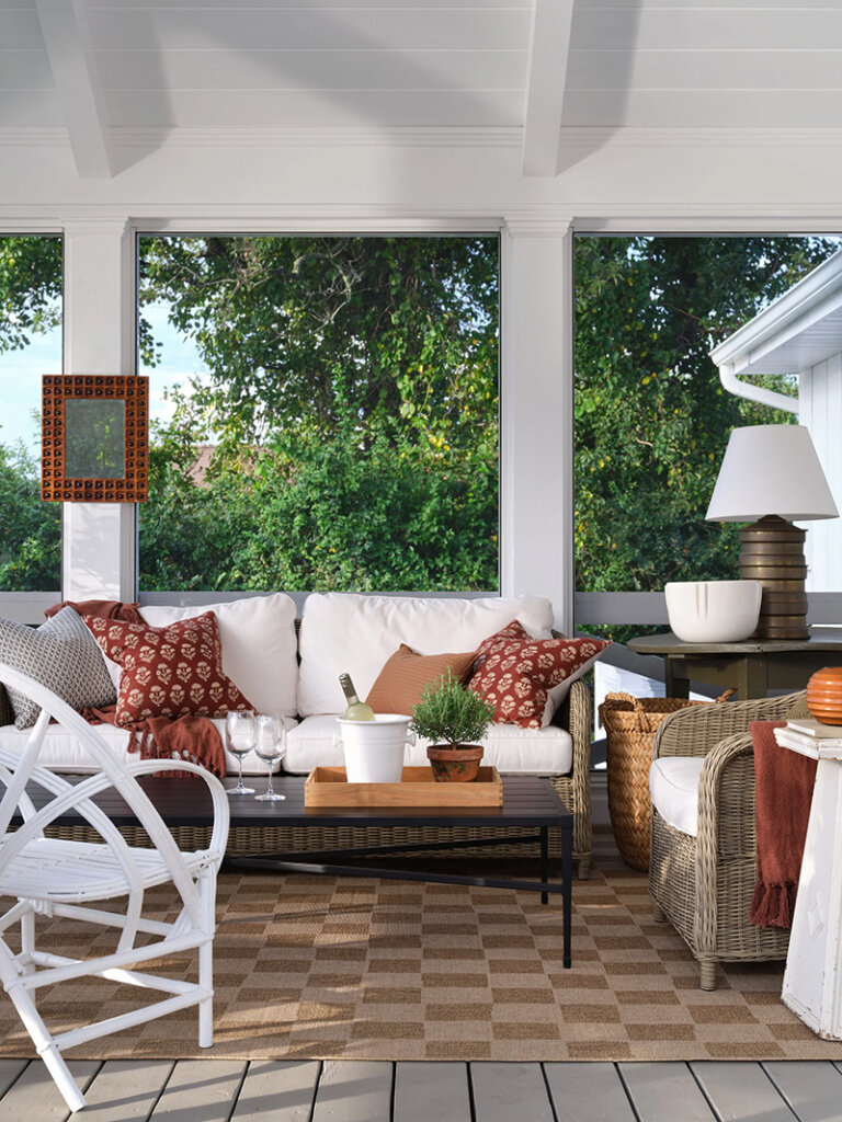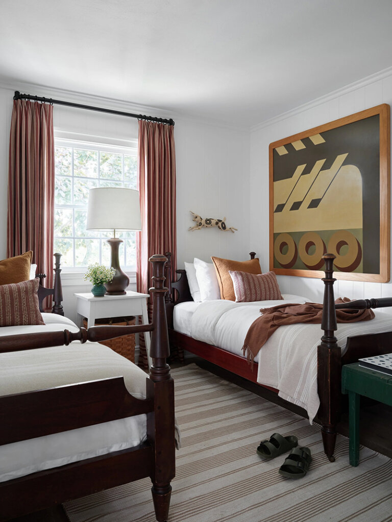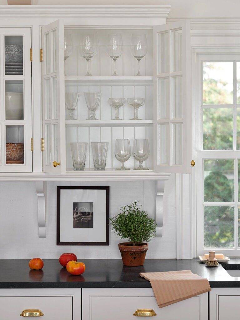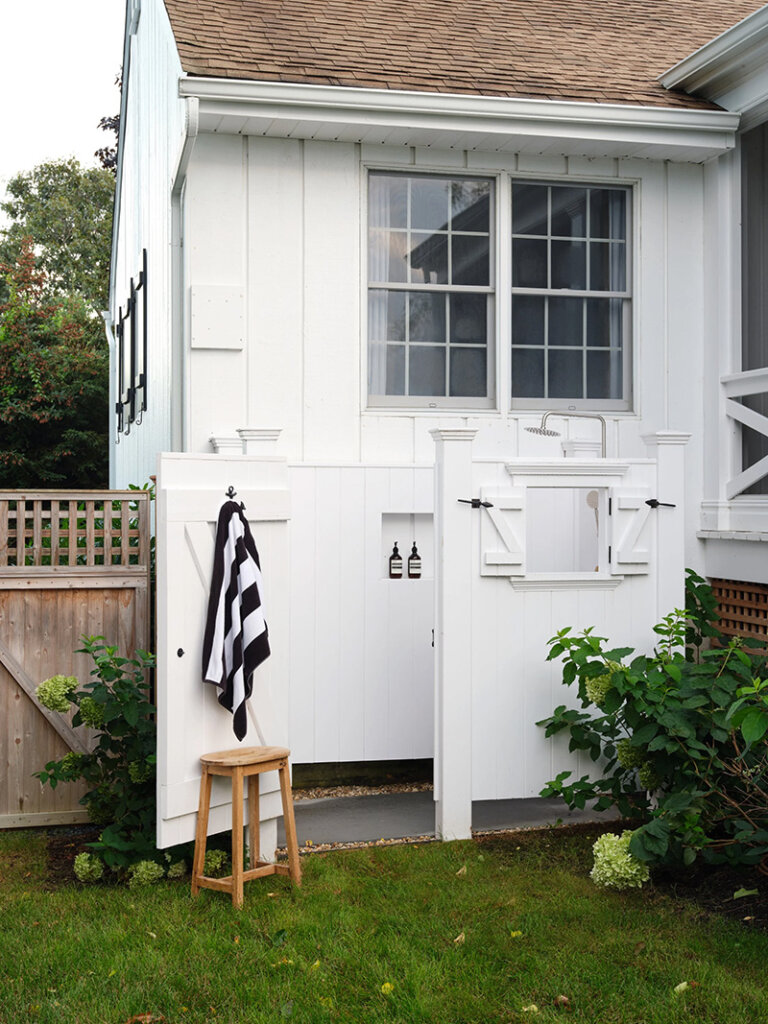 At only 1500 sq ft, this 1960s ranch house in on the North Fork of Long Island seems much larger with it’s white painted walls and ceilings (vaulter ceilings sure help), the addition of a screened porch that feels like an extension of the living room and a new window in the kitchen. Some casual furnishings (in a high-low mix) in shades of white, dark and wood make this weekend retreat an absolute delight for designer and homeowner Dan Mazzarini of BHDM. Photos: Reid Rolls.