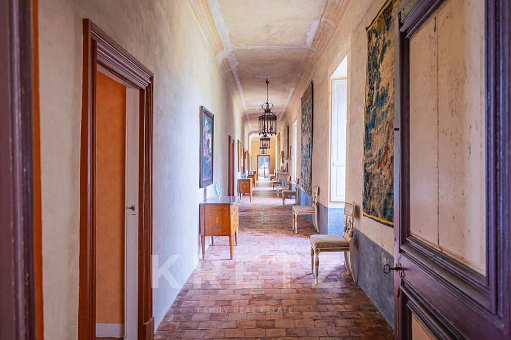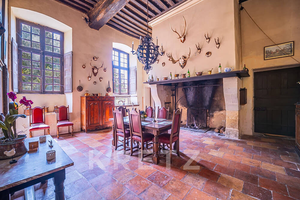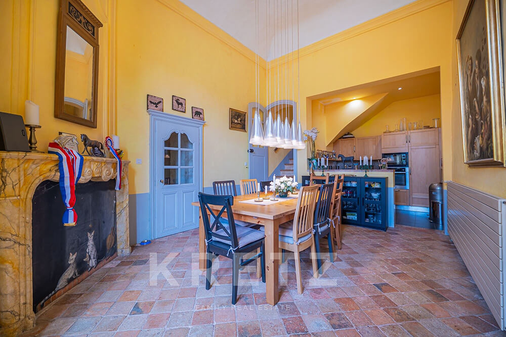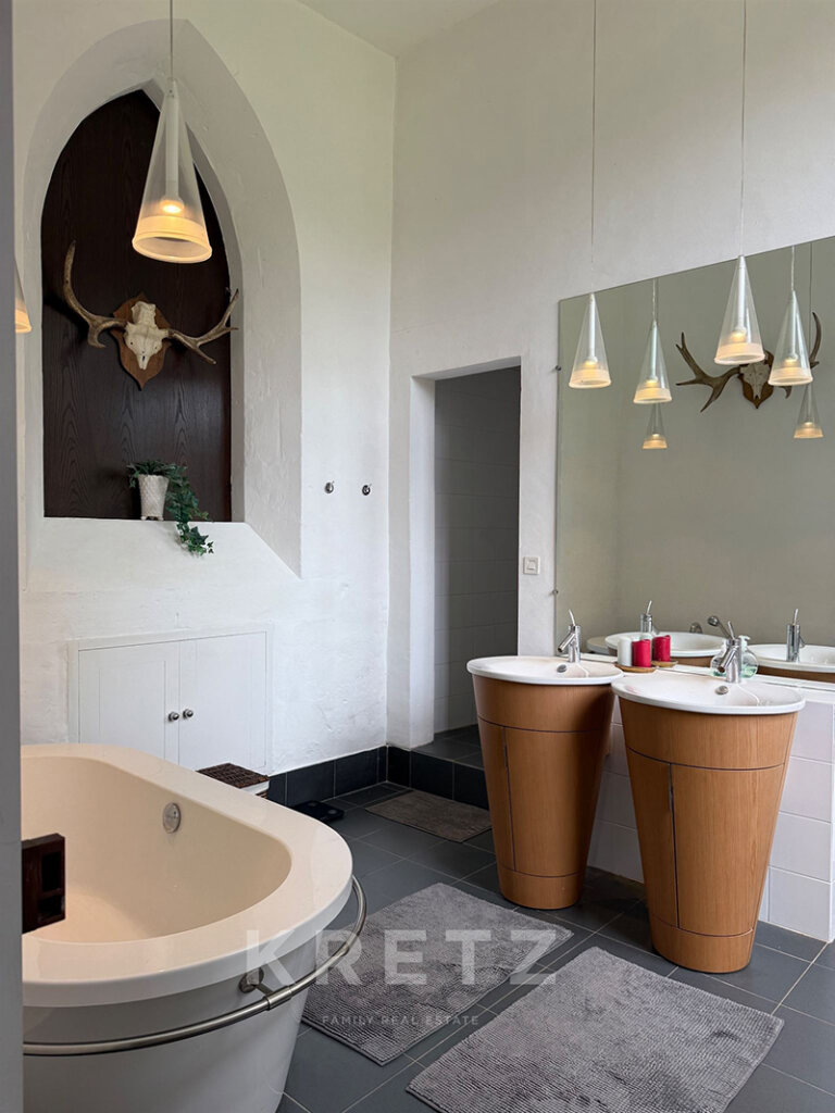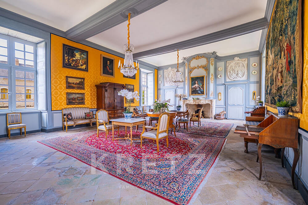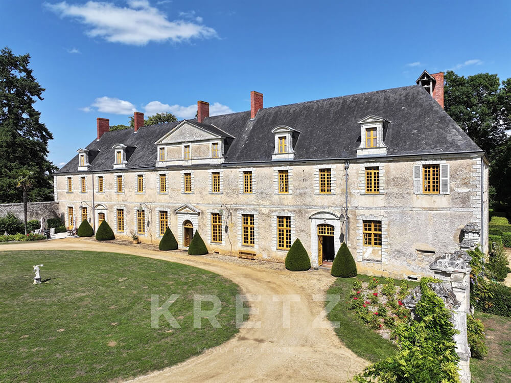 On the outskirts of a village in the Haut Anjou region stands this remarkable château built by a superintendent of finance for the Sun King in the late 17th century, whose classical architecture is matched only by the refinement of its interior decor. The château offers over 800m2 of living space and more than 20 rooms, including superb reception rooms on the ground floor with sumptuous Louis XV decorations: vestibule d’honneur, grand salon with rocaille gypseries and wood panelling, dining room with fountain and Solesmes marble fireplace, wine cellar, 18th-century kitchen with kitchen garden and 5-meter-high ceiling, grand baluster staircase, salon with fireplace, vaulted hall (former chapel), bathroom, study, summer kitchen. Second floor: apartment comprising kitchen, bedroom, living room with superb wood panelling, bathroom, toilet, large gallery opening onto 8 bedrooms with bathrooms. The entire property was completely renovated (except for some windows) in the 1990s (roofing, plumbing, electricity), with minor refurbishment to be scheduled. A vast outbuilding wing comprising stables (two boxes), marble dairy, bread oven, sheds and a renovated janitor’s cottage with two bedrooms, kitchen, living room, closes off the courtyard of honor. Well, rose garden. The whole forms a peaceful estate on over 18ha of land, including lawn with boxwood parterre, meadows, woods and a river forming an island, as well as fine recent equestrian facilities and a tower used as a dovecote.