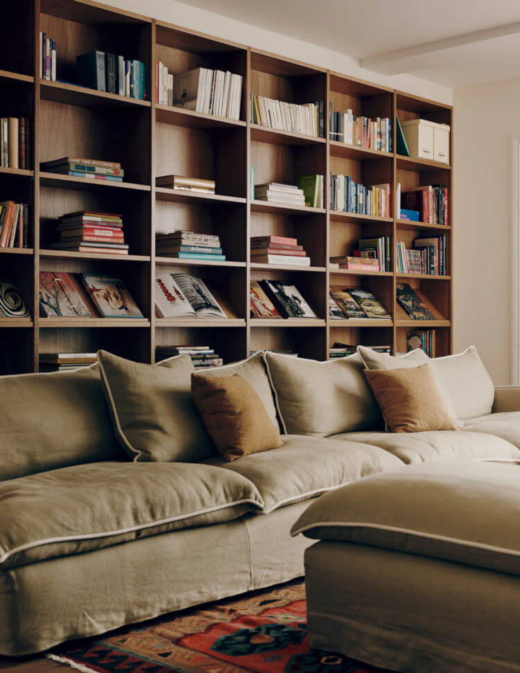In Nina’s latest project the design grasscloth walls flow through sitting and dining spaces, paired with sculptural stone, soft fabrics and vintage moments full of character. The kitchen glows with veined marble and brass, while the kids’ bath mixes playful contrasts and classic notes. A tailored family room, lined with oak and a deep custom sofa, brings everything together with comfort, personality and quiet elegance.
