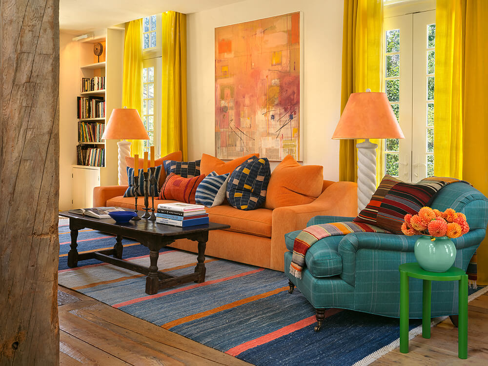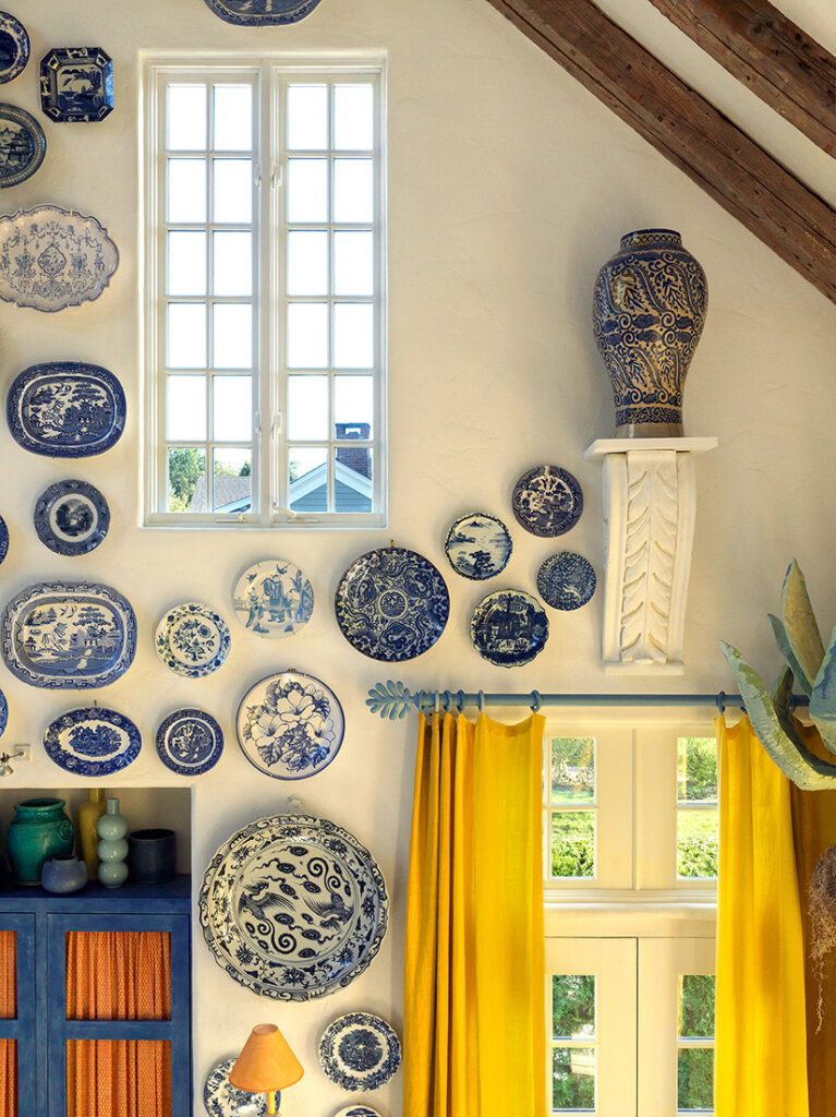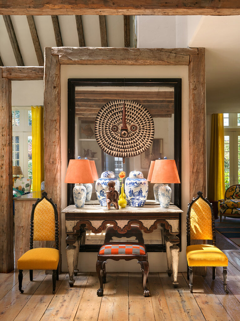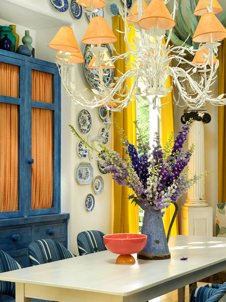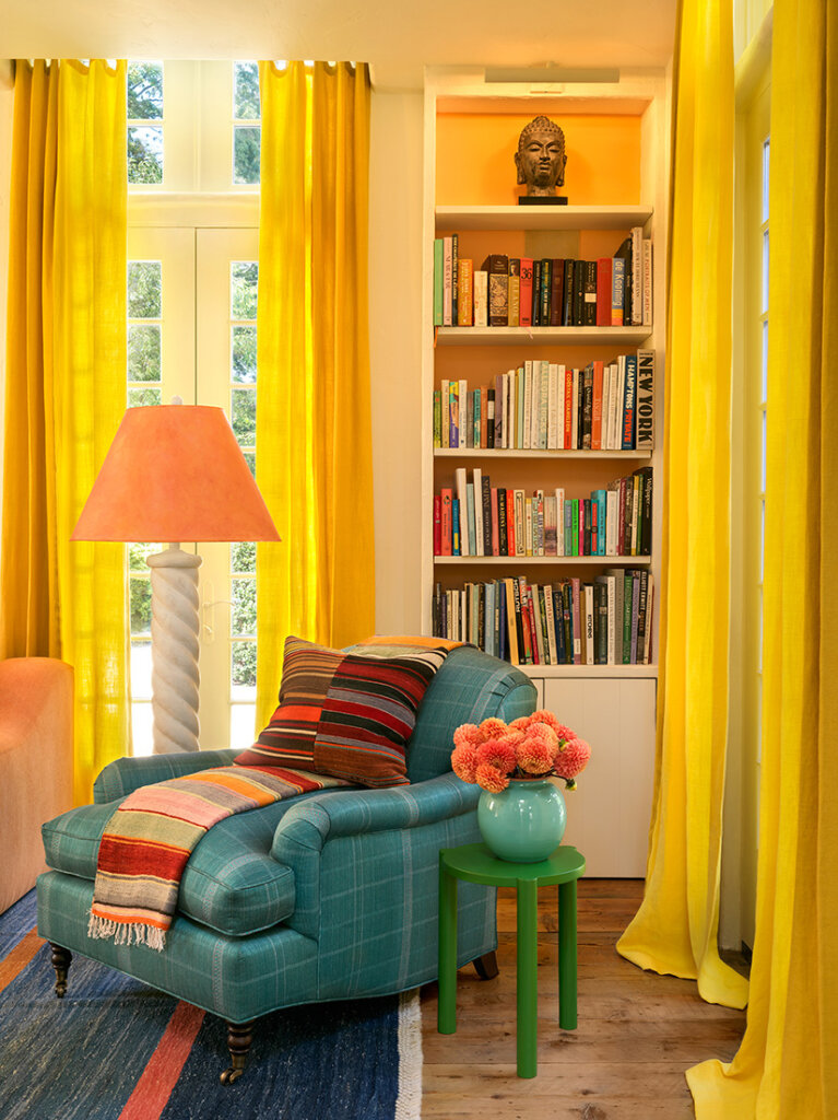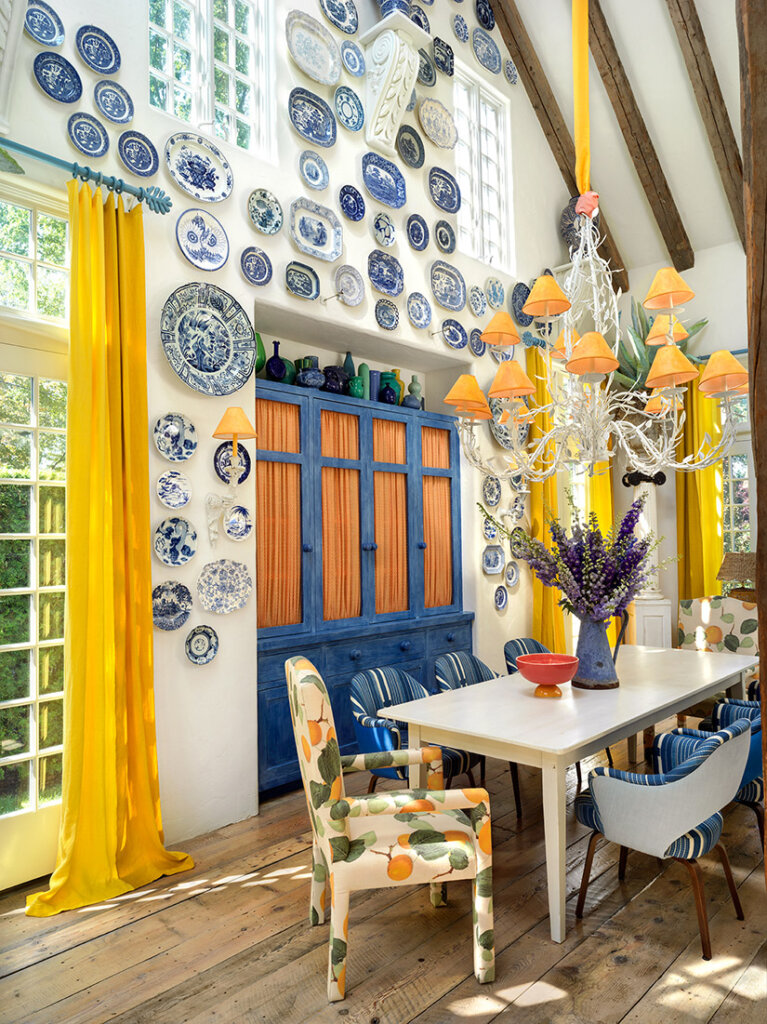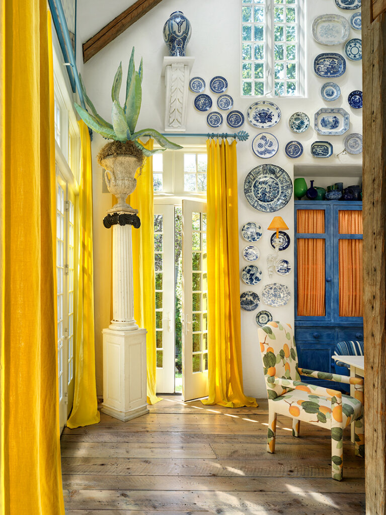 Rowayton Barn in Norwalk, Connecticut was originally designed and built by Barbara Garfield and its 1,645 square foot interior has been infused with tons of personality, eclecticism and the most beautiful boldly bright colours by designer Patrick Mele. Stunning yellow curtains (made from 2 yellow Designers Guild fabrics), Corinthian columns, a collection of 125 plates hanging on the dining room wall, a plethora of colours unite in the living room, a guest bed swathed in fabrics, a tapestry in a guest bedroom and so much more make this home so unique and cheerful, and “Belgium meets Beverly Hills” as Patrick put it. Photos: Ellen McDermott.