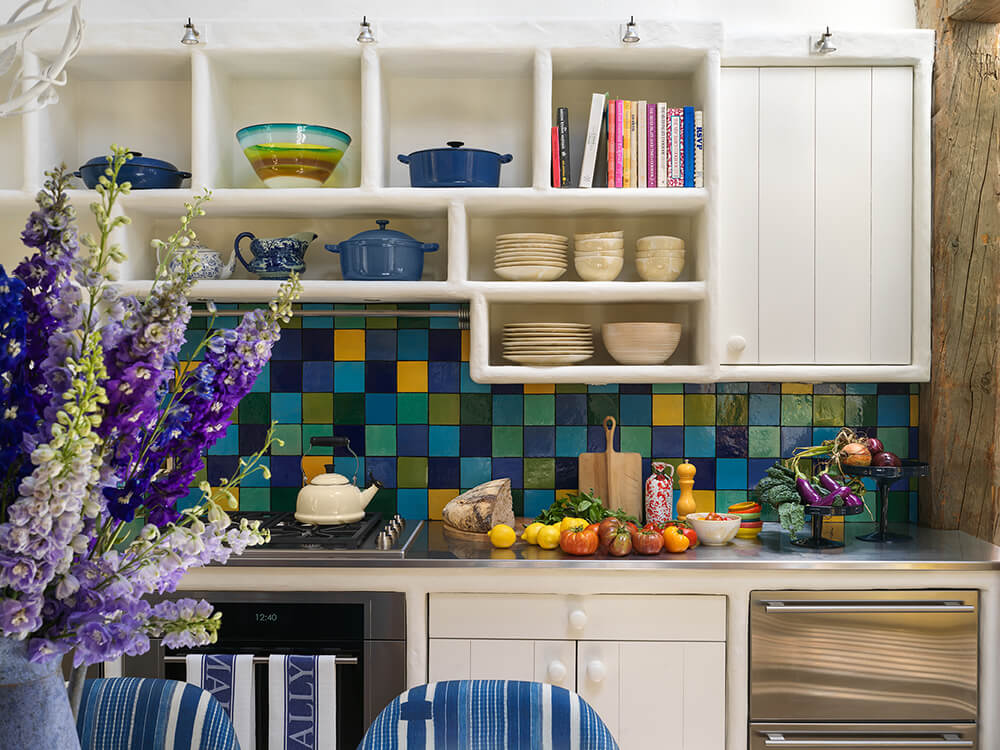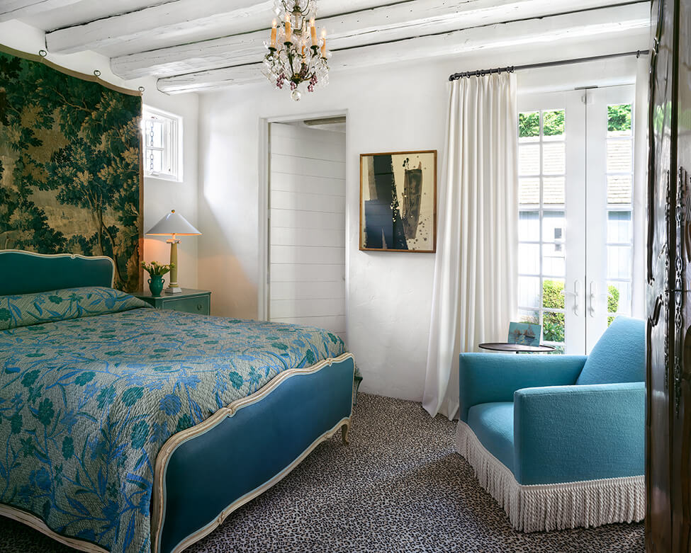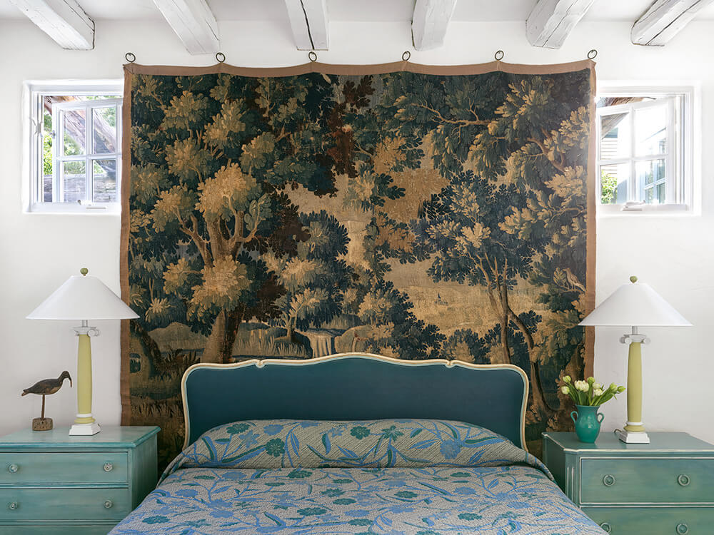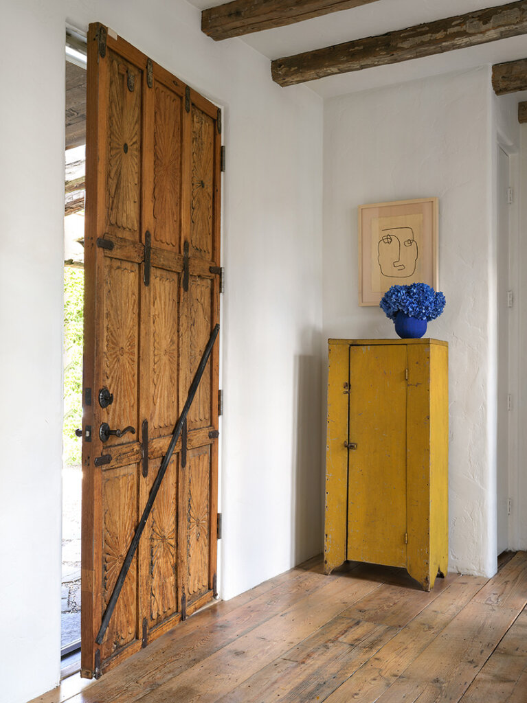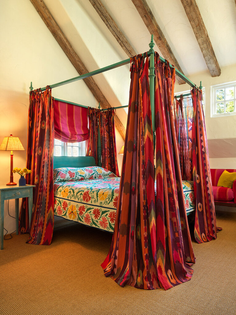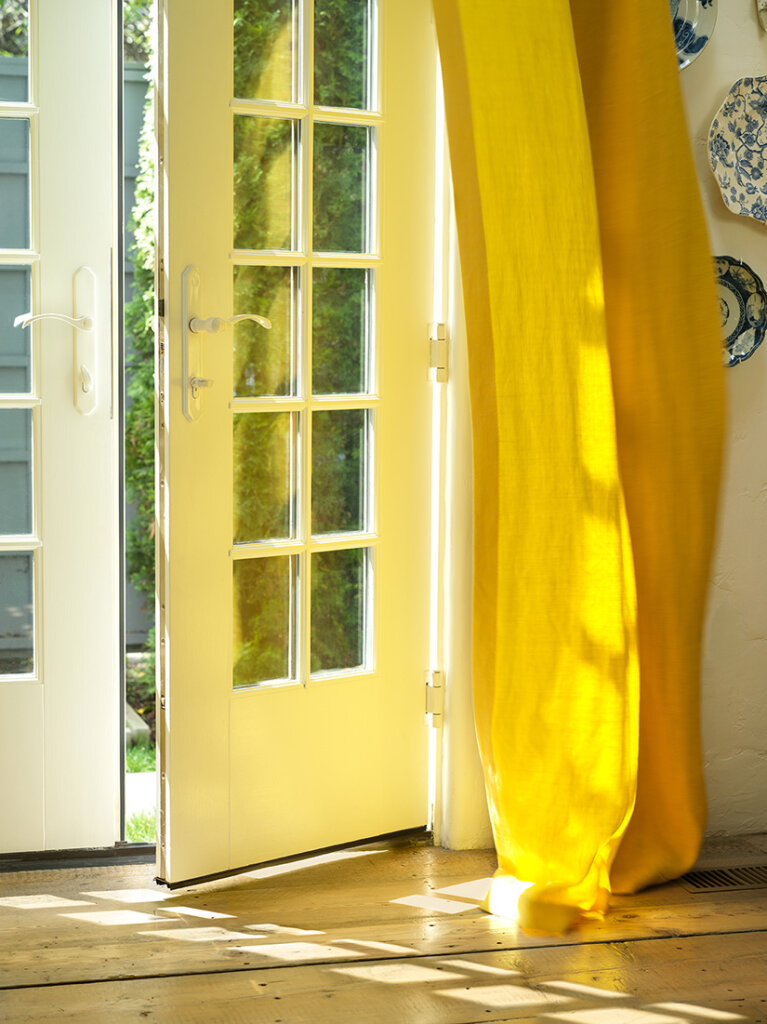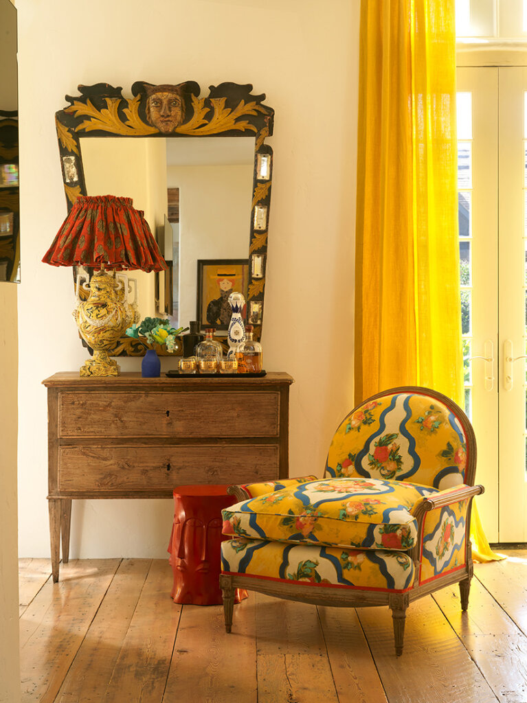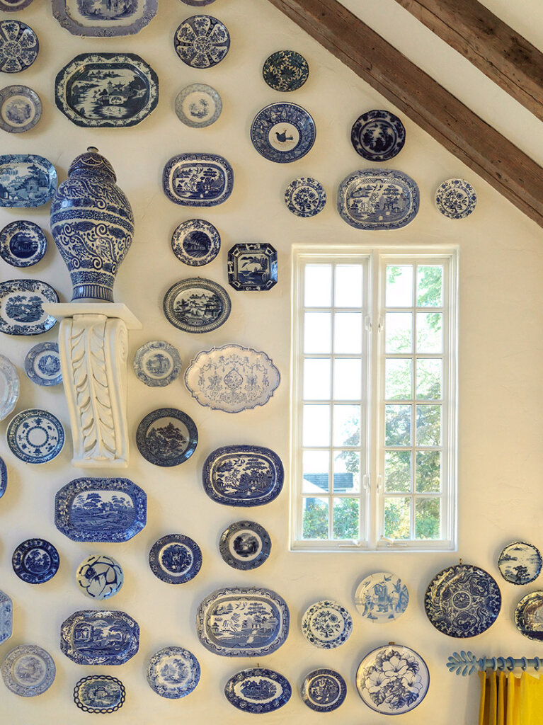 Rowayton Barn in Norwalk, Connecticut was originally designed and built by Barbara Garfield and its 1,645 square foot interior has been infused with tons of personality, eclecticism and the most beautiful boldly bright colours by designer Patrick Mele. Stunning yellow curtains (made from 2 yellow Designers Guild fabrics), Corinthian columns, a collection of 125 plates hanging on the dining room wall, a plethora of colours unite in the living room, a guest bed swathed in fabrics, a tapestry in a guest bedroom and so much more make this home so unique and cheerful, and “Belgium meets Beverly Hills” as Patrick put it. Photos: Ellen McDermott.