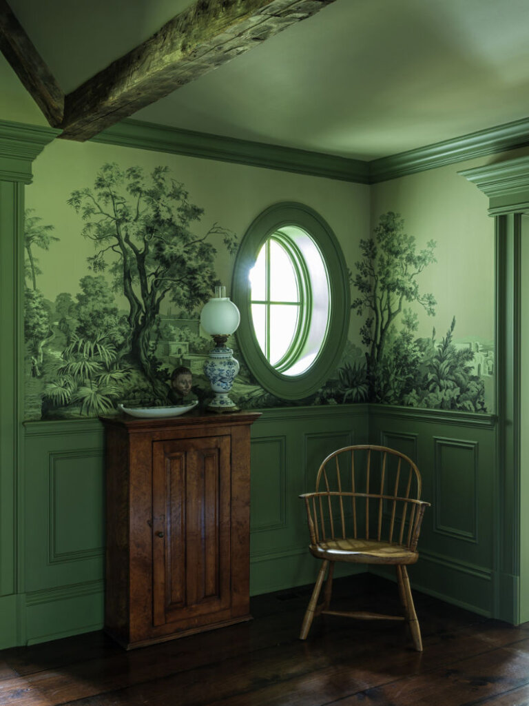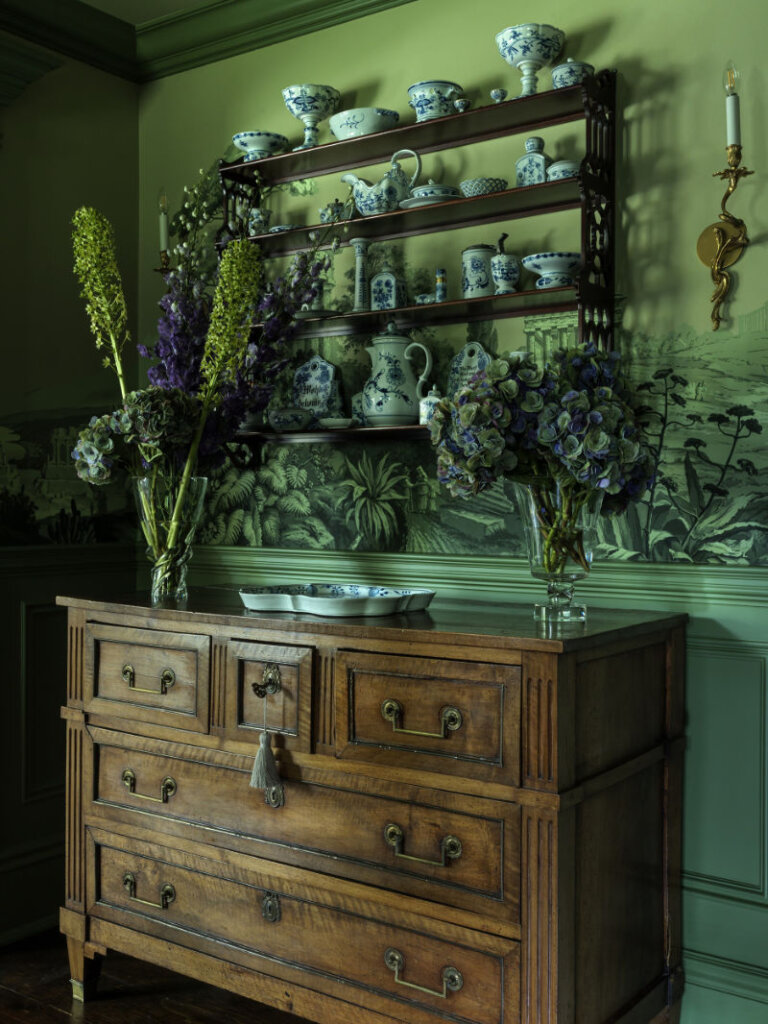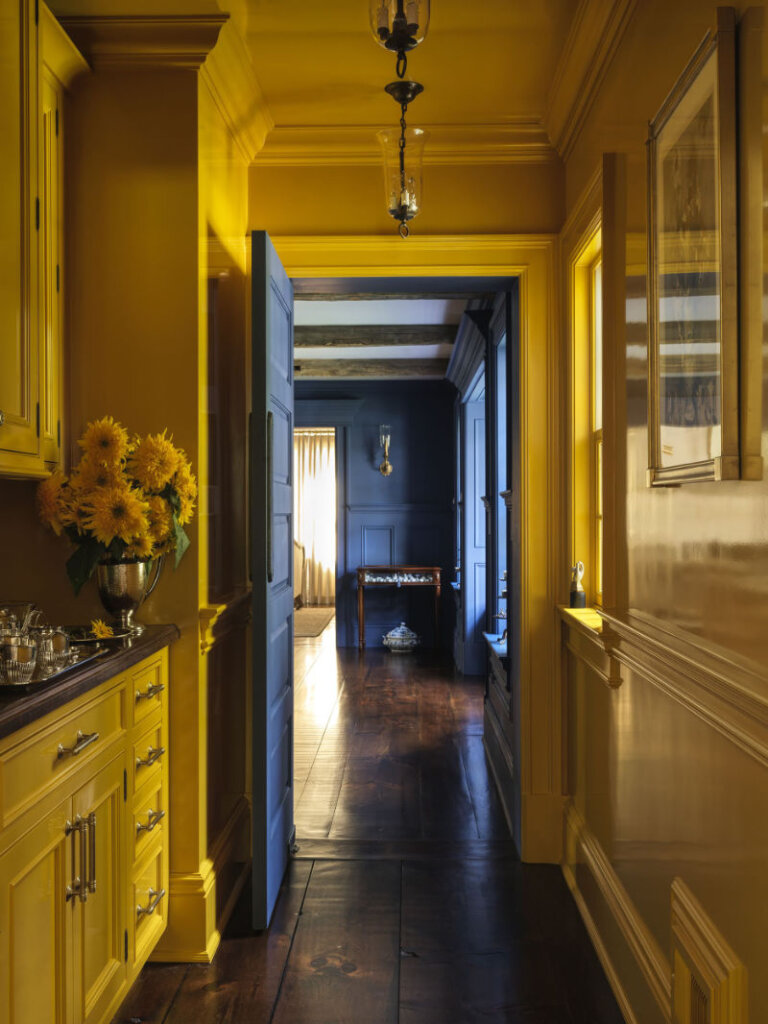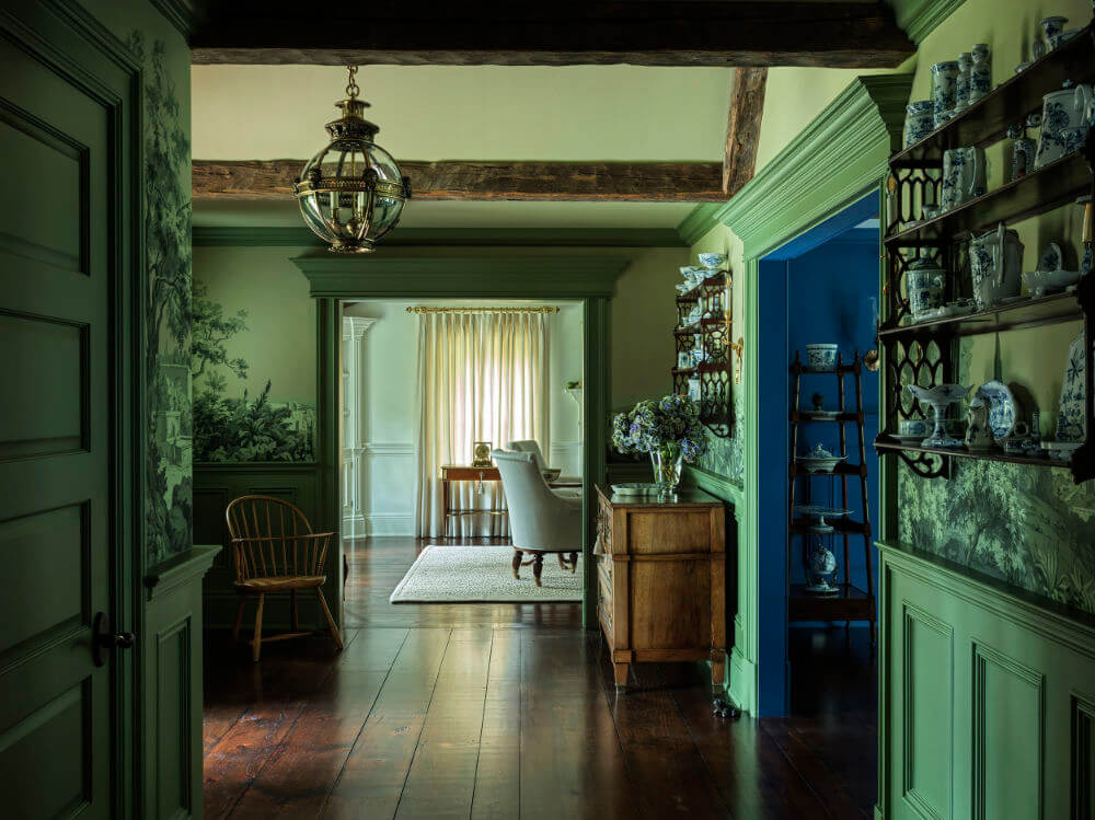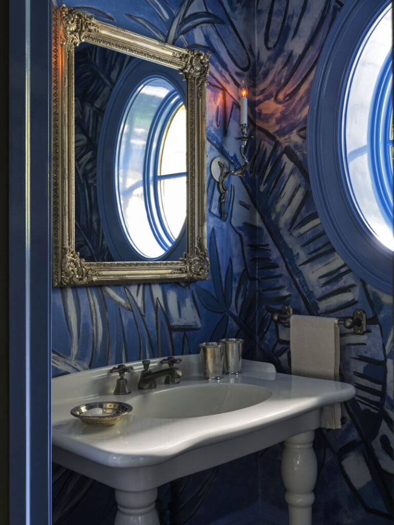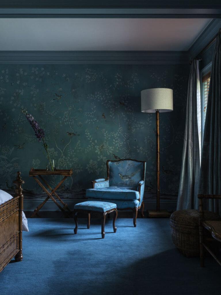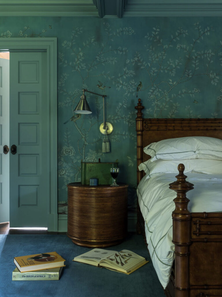 I am completely smitten with this 8,300 sq ft 1950s farmhouse in Westchester, New York designed by Sally Rigg of Rigg Design. Bold colour choices slap you in the face as soon as you walk in the front door – Ressource Paints’ La Pinède green on the walls paired with scenic Zuber wallpaper, then a dining room in a blue as blue can be (Farrow & Ball’s Dinnerware), which leads into a curry yellow butler’s pantry. The colours come at you again in the primary bedroom with a gorgeous de Gournay wall covering. I love that there are rooms of total drama and colour drenching but then some moments of calm with mostly white spaces. It makes the colourful rooms that much more impactful. Photos: Chris Mottalini.