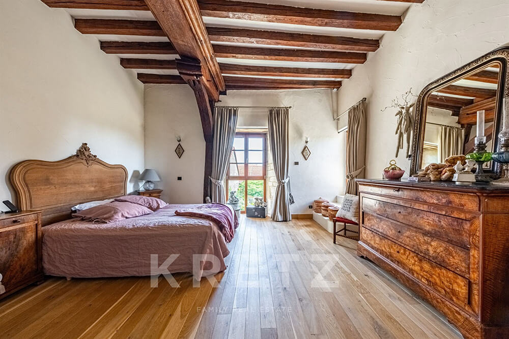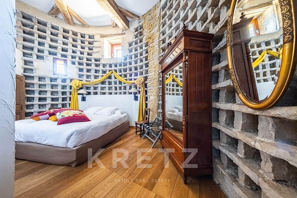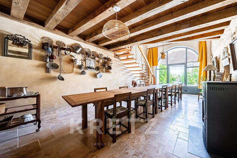 In the heart of a wooded park of more than 1 hectare, magnificent stately home from the 15th and 16th centuries, fully restored with taste and precision. French ceilings, beautiful heights, stone walls and floors, period fireplaces, majestic spiral staircase, parquet floors. On the ground floor, open-plan fitted kitchen, dining room and living room with fireplace, winter lounge under veranda, large reception room, pantry. Two bedrooms on one level with their private bathrooms. On the 1st floor, 5 bedrooms, 4 bathrooms/shower rooms, dressing room and storage. On the 2nd floor, convertible attic. A separate apartment with 1 bedroom and bathroom, living room-kitchen. A dovecote renovated into an atypical duplex with 1 bedroom and bathroom, living room-kitchen area. Wooded park, garden, gravelled interior courtyard, secure parking for 6 vehicles. Swimming pool. Tennis court in need of renovation. 3 cellars.