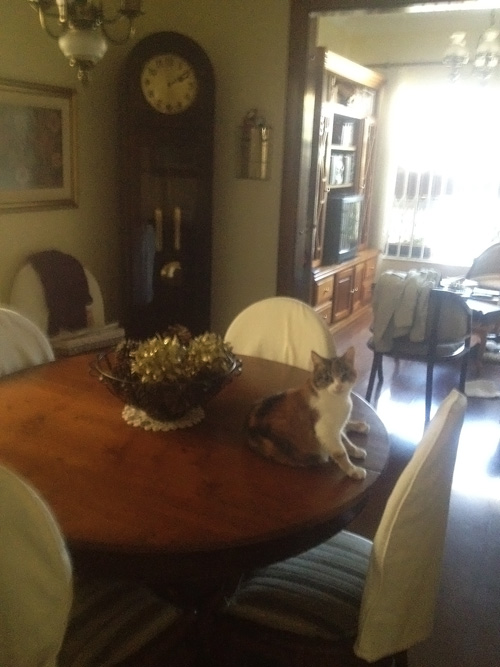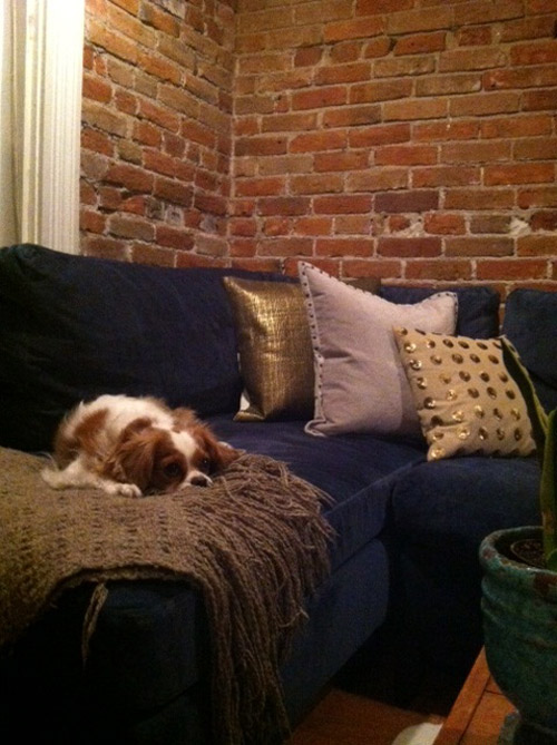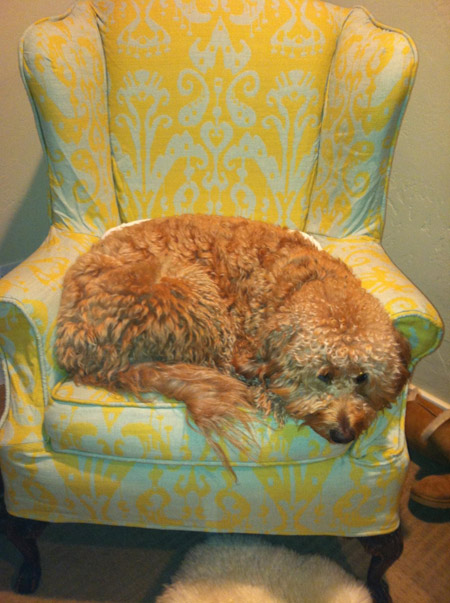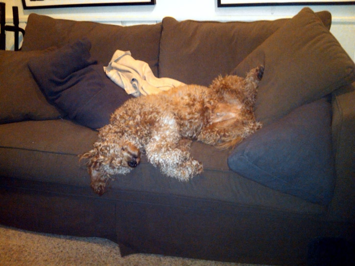 This is Billie – she is tuckered out on the blue couch after a dinner party!