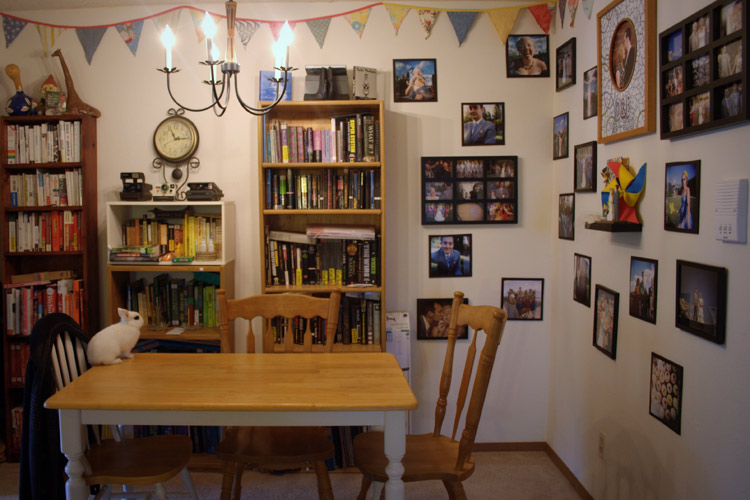 I am a terrible bunny-torturer: I put Buster up on this table for the picture. He normally sticks to the couches, but they’re not as cute as this little corner.