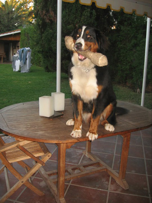 Whenever my dog misbehaves, I send her outside to “reflect” on her bad deed 😛 When I do, she wants to peep into the house, and watch what’s going on inside, so she jumps on the garden table and peeps through the kitchen windows. Hope you like the picture!!! PS. It’s quite funny because she is enormous!!!! Her name is Foca (seal in spanish, because she looks like a plumpy little seal and loves the sea!!!), she’s a 5 year old Bernese Mountain Dog, and really really smart and funny. Always wants to play and go out for a walk. And she tends to steal yummy stuff from the kitchen.