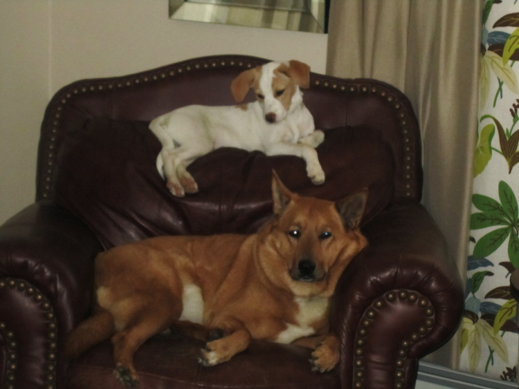 Alphie is our 2 year old Collie Shepard and his sidekick is our new pup, Rincon. We adopted Rincon during our Easter vacation in Rincon, Puerto Rico and she is a mix with a lot of Jack Russell in her. They both have their own leather pub chair but in this photo Rincon has decided that on top of the chair gives her a much needed advantage on Alphie.