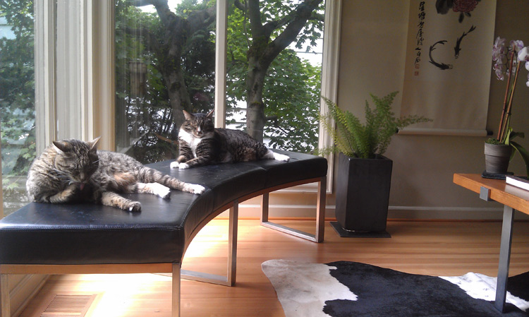 Attached is a picture of my cats Oscar and Alfred, who are bengal-manx brothers, on a bench in my living room. A rare sunny afternoon in Portland, OR in June.