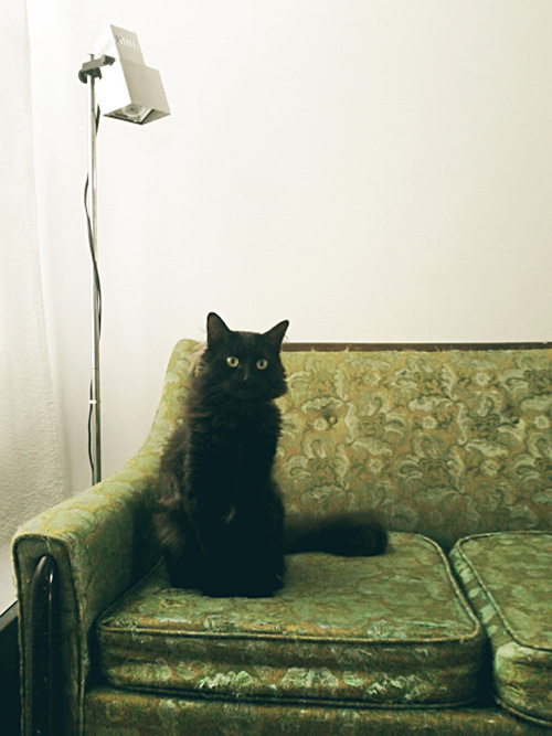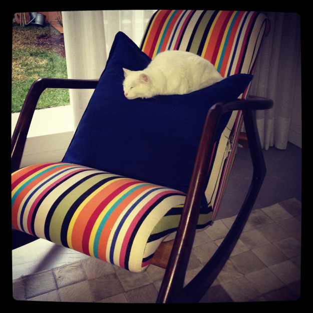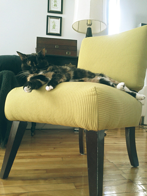 Here are my two adorable babies. Leo, the devilish Maine Coon mix, posing for me on the mid century modern couch I inherited from my grandma. The upholstery is from 1971 and Leo absolutely LOVES to use it as a scratching couch… The other picture features little girl Eva a.k.a. Queen of the House, lounging on her throne which is actually another piece of furniture I got from my grandma and that my mom patiently reupholstered.