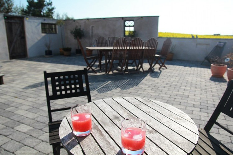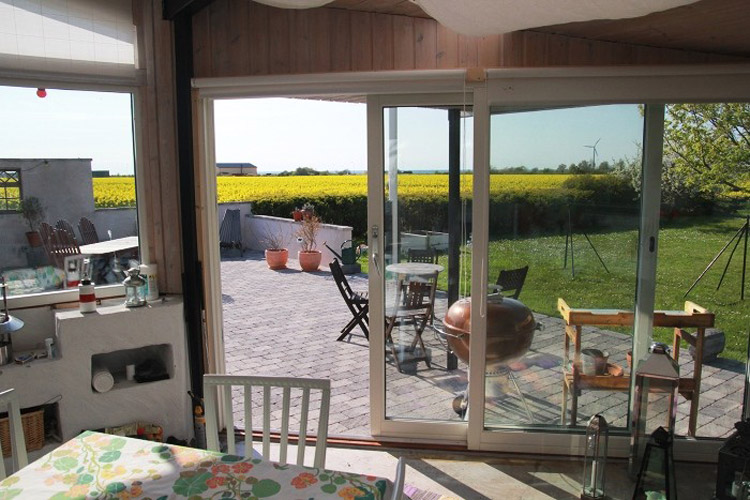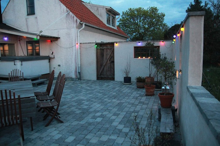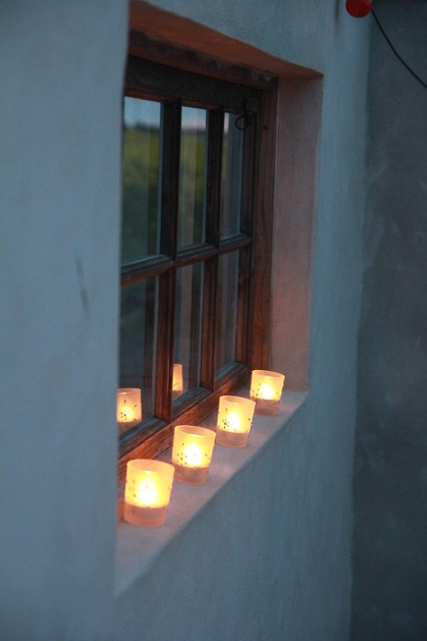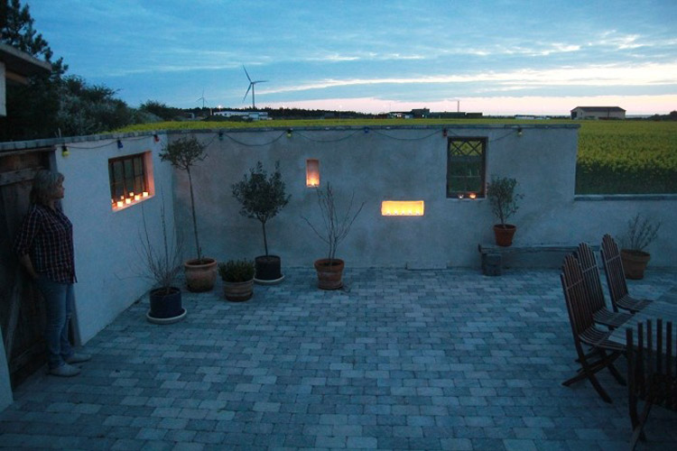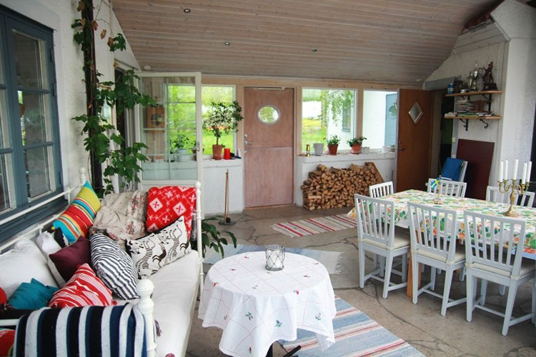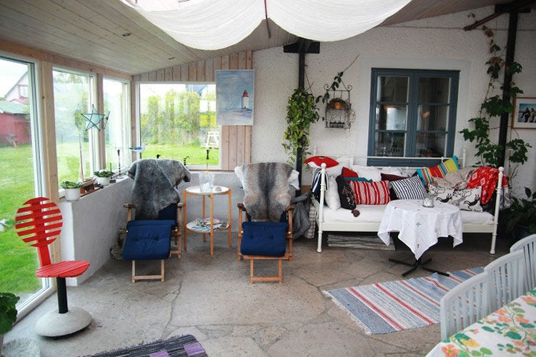 I’ve got one last reader’s home to share this week. It’s actually a reader’s mom’s home. We received this email from Linn: I recently came back after visiting family in Sweden. My mom lives on the Baltic island of Gotland where she lives in a picturesque house, and the sunroom and patio in particular are just lovely. In the sunroom there is plenty of light and she has a huge dining table with room for many, classic Swedish rag rugs on the floor as well as other comfortable furniture and nice details. The sunroom leads directly out to a stone patio where there is a cement wall with real windows that block the wind, lots of candles and lanterns, and a great view. All in all, this space is just so charming and comfortable to spend time in, I’m beyond jealous myself! I’m jealous too! I am especially fond of the huge patio with the walls that make it look like another room of the home. I would spend every moment of decent weather out there. And it’s extra gorgeous with the candles and string of lights.