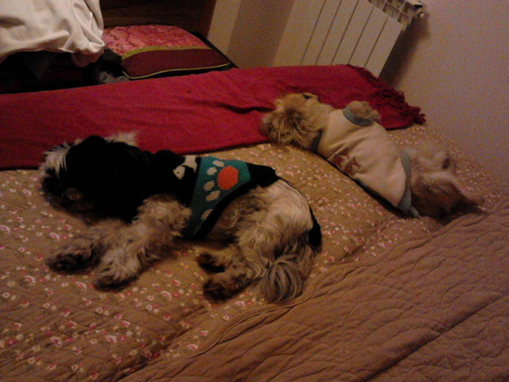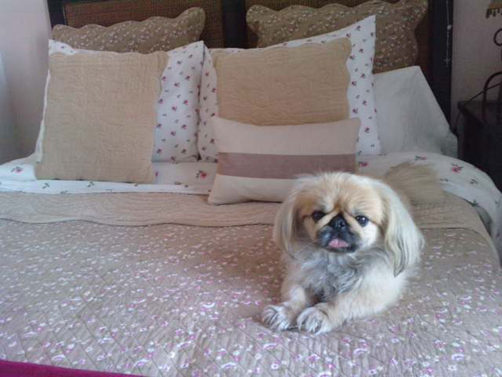 The shiztu (black and white) is Tommy and the other one (pequinois) is Furby cause he looks so damn much with that toy.