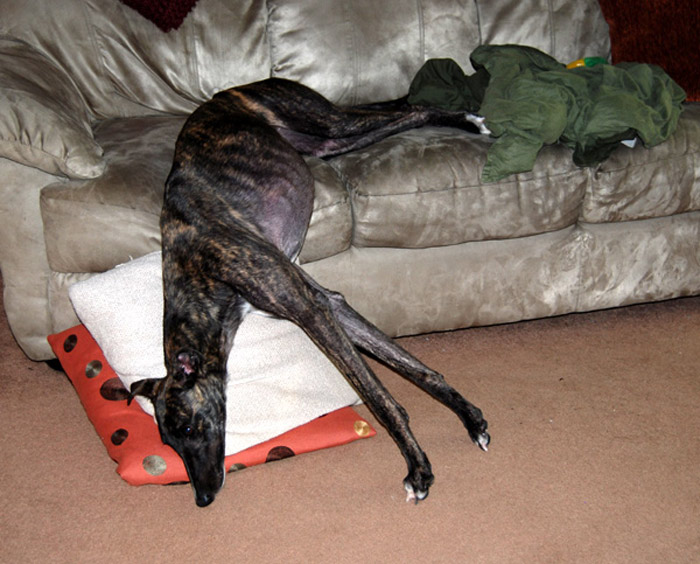 “Kat” is my rescued greyhound. She’s having a little trouble getting used to sleeping on the couch.
