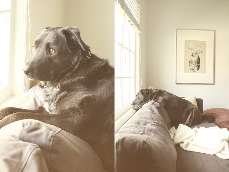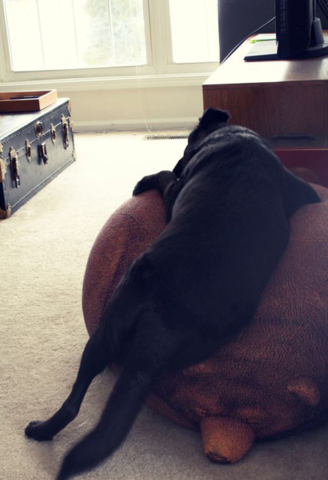 Here is our Logan on his favorite bean bag bear. He’s too big to fit on it now but as a pup it was his hangout spot. These days he favors our Karlstad sofa (with added mid-century style legs) in front of the window.