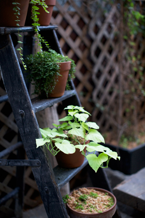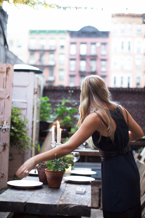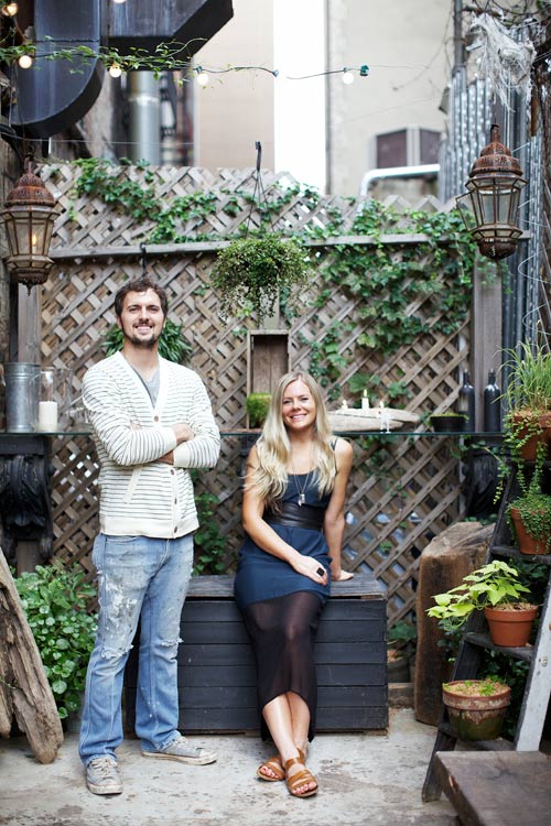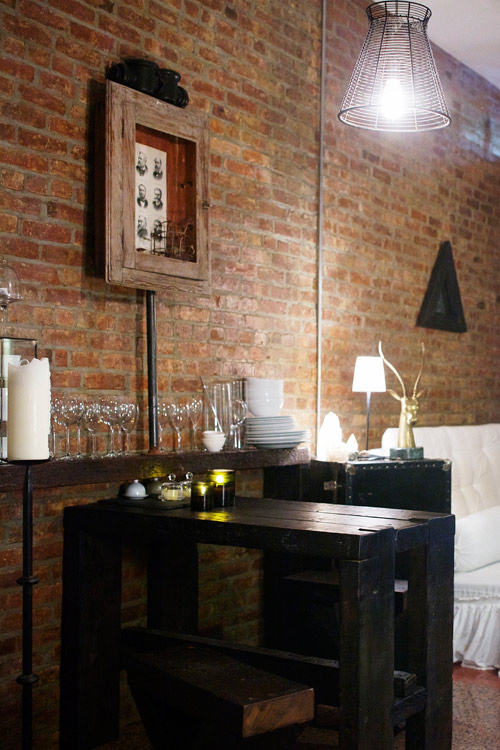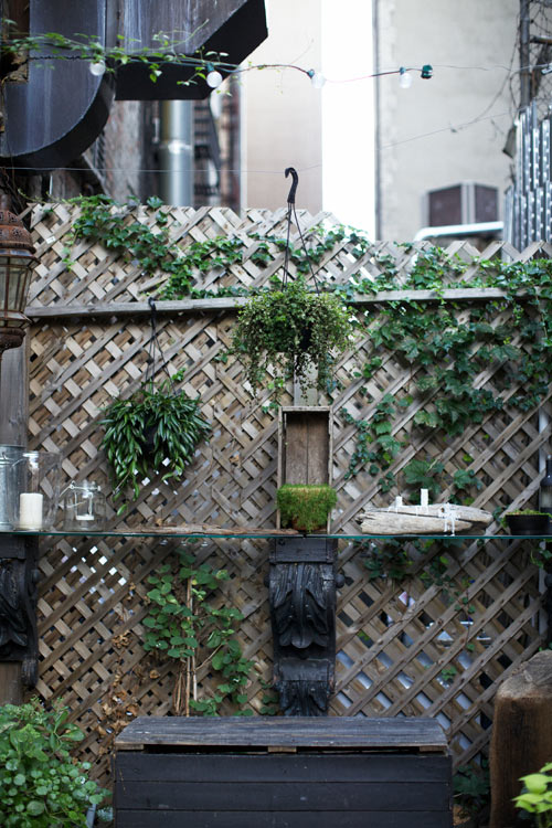 We received some amazing photos of an apartment that I had to share with you all. It’s the 375 square foot New York pad of Daniel Grady Faires (New York design and furniture guru and featured on season 5 of HGTV’s “Design Star” and now has his own show “DanMade” ) and his wife Dasha. Here’s a bit of info: Daniel and Dasha Faires love their 375-square-foot apartment on Ludlow Street in New York’s Lower East Side. The 100-year-old brick building is situated where Daniel finds inspiration for the furniture he creates. The apartment features only two rooms, plus a great garden area, where the husband and wife entertain. And the pair have certainly created a warm and cozy feel – with the help of well-placed mirrors, candles and Edison bulbs to create a dreamy, low-lit haven. Daniel designs and builds much of what is in the apartment – with the help of items they find on the street – creativity is definitely their strong point. Their dining table and outdoor seating were all made of reclaimed wood from their neighborhood and the custom spice rack was designed and built by Daniel also. It’s so cute! And that outdoor space is gorgeous! I would spend every waking moment (weather permitting) out there. (Photos by Emily Johnston Anderson)