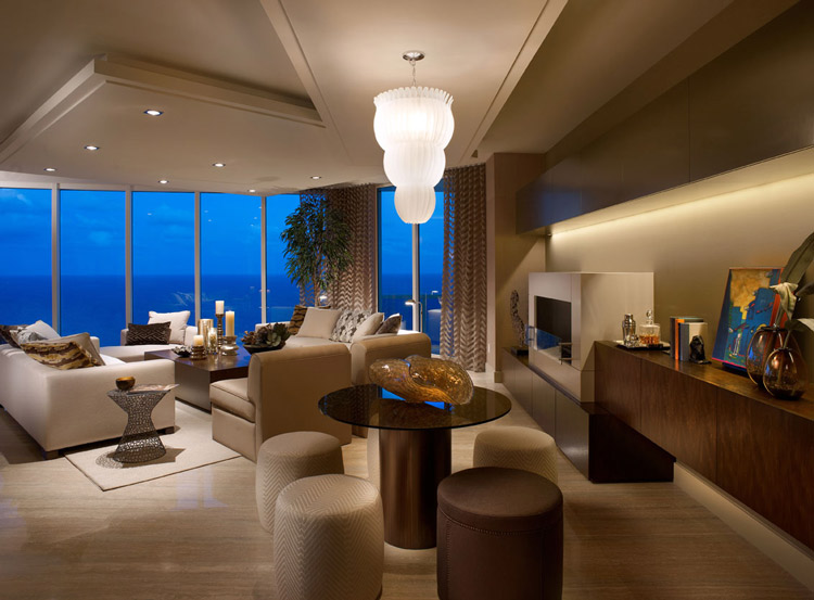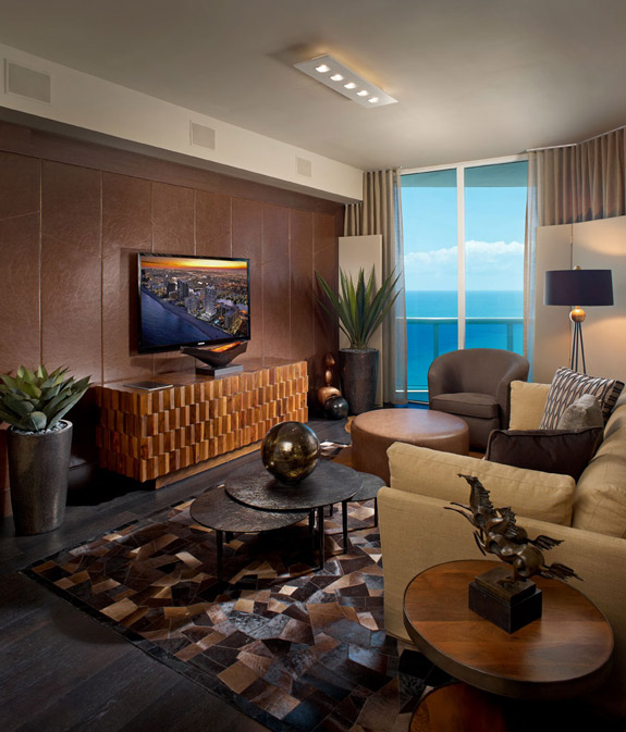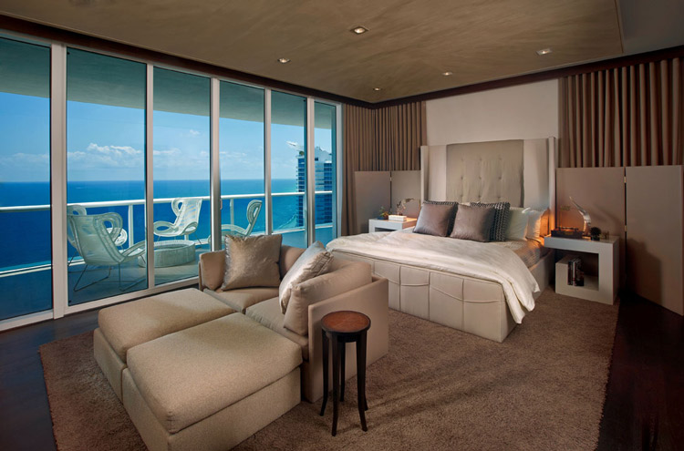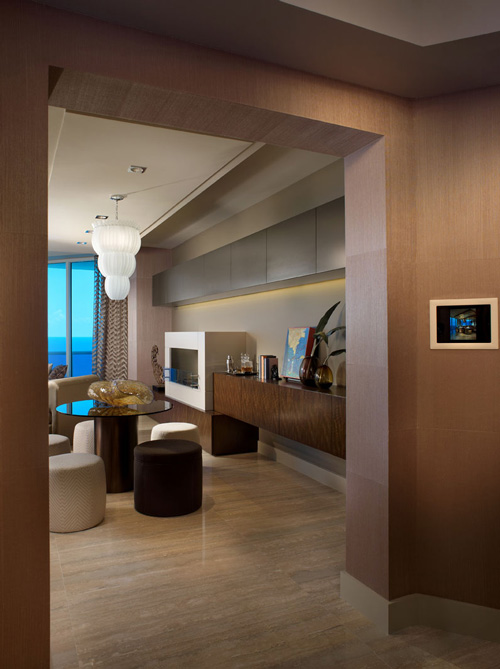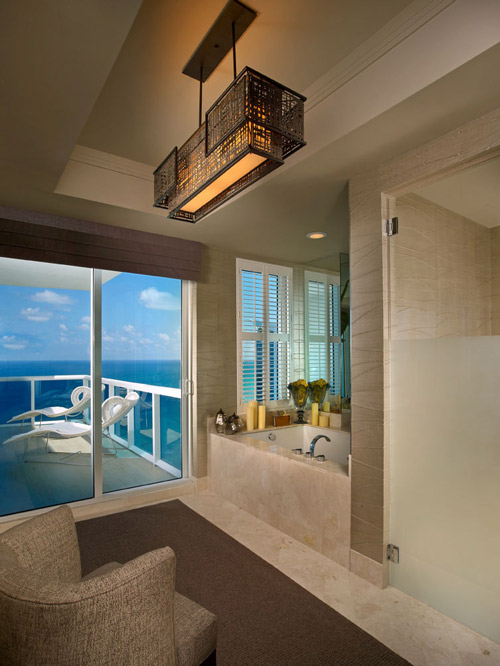 I am in desperate need of a vacation – well, a break from the chaos that is my life these days anyway. I’d love to spend a few weeks shacked up in this absolutely stunning vacation home in Trump Hollywood, in Florida. The model homes were decorated by award-winning designer Steven G. Here are some detials: The new 5,000+-square-foot Sky Residence, located on the 36th floor, is designed for those desiring the spaciousness of a private home and the luxury lifestyle of a turnkey condominium. The design palate, focusing on earth tones and rich, deep woods, is offset by an elegant travertine marble floor with unique tones of aqua and taupe. All the furniture was custom made for the residence, and a working fireplace in the living room sets a warm mood that is accentuated by magnificent Atlantic Ocean views. Now THAT is HOT.