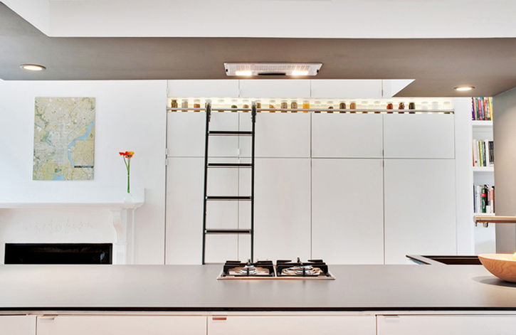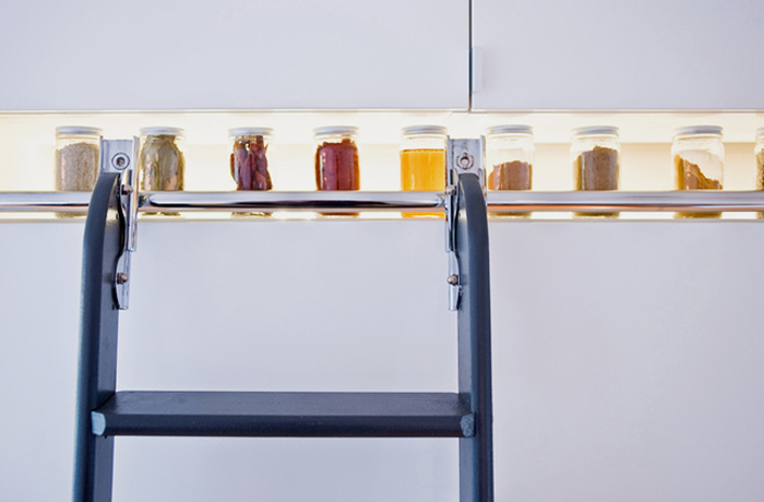 I LOVE this kitchen renovation I found on Dwell, in particular the integrated row for spice jars created between sections of Ikea cabinetry. (It reminds me of the row of jars filled with dry goods I had created in the kitchen of my previous home. I miss the convenience of it ALOT).