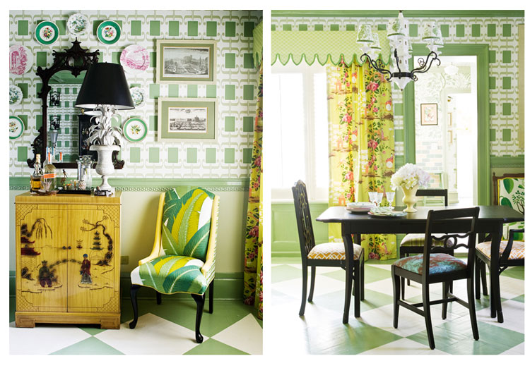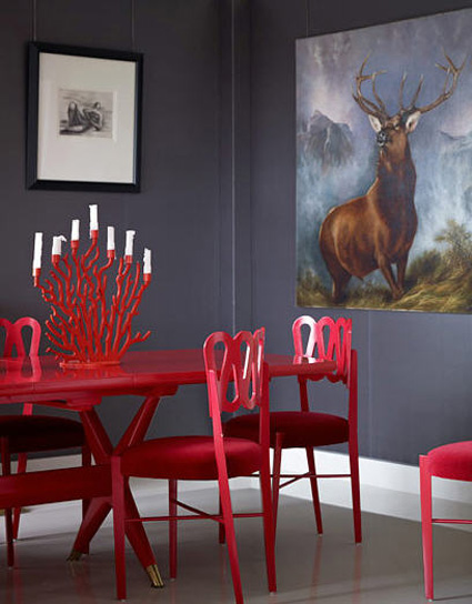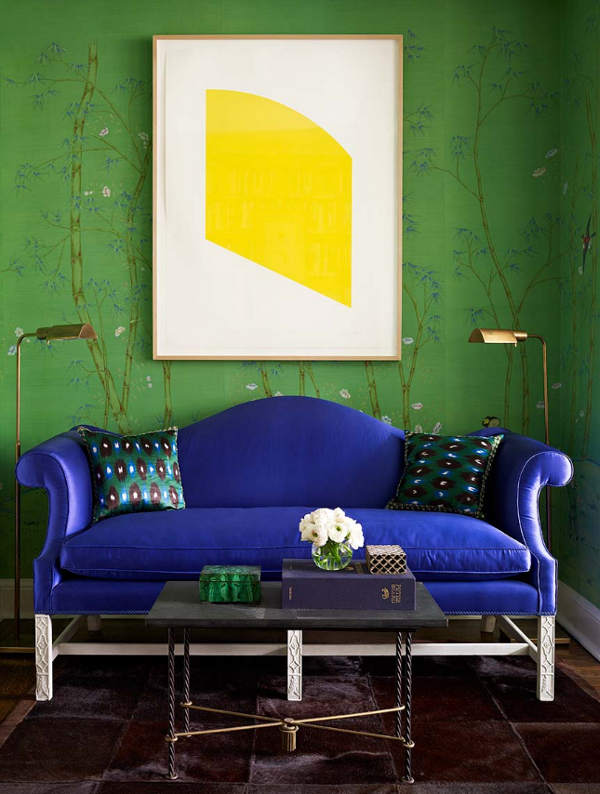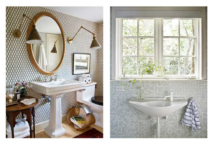 This request comes from Becky: “I need some help revamping my bathroom. Right now its a soft gray and I’m kind of tired of it, kind of blah. So I’m wondering if you have any inspiration for color in a bathroom? My bathroom is a medium size with a claw foot tub and white subway tile in the shower, dark stained vanity with Carrera Marble top, so a bit old fashioned however I am a lover of vintage modern so if you have any bathrooms that might meld the 2 styles I would be eternally grateful!” Now I have quite a few bathroom photos stashed away but to find some that were colourful, with traditional and vintage modern styles mized together etc etc was not bloody likely. So instead I decided to select some photos of colourful bathrooms that I think could work with Becky’s existing features (well, I think any colours would work) and I included a few with wallpaper because that could be really fun (not to install but to enjoy afterwards – LOL).