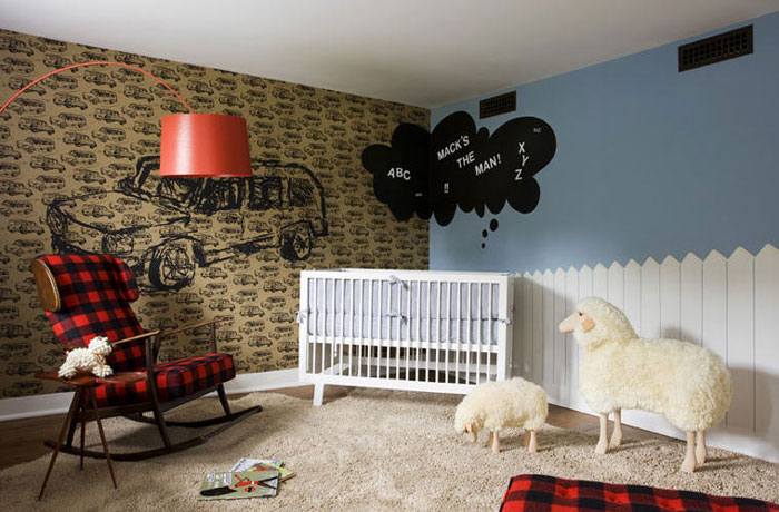 A child’s room. In my son’s room I also renewed the floor, the ceiling and the walls, though for wall decoration I’ve chosen a simple method – I painted white the existing brownish rugged wallpaper. Instead of the carpet we used a stencil of a stylized whale while my son got creative and decorated the legs of the old stool in the same manner.