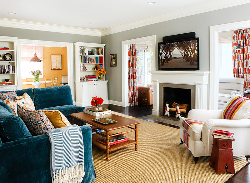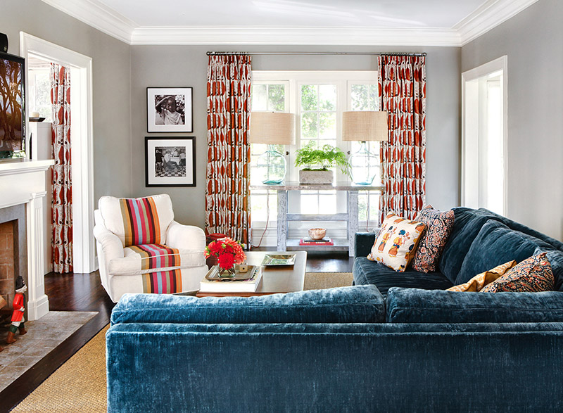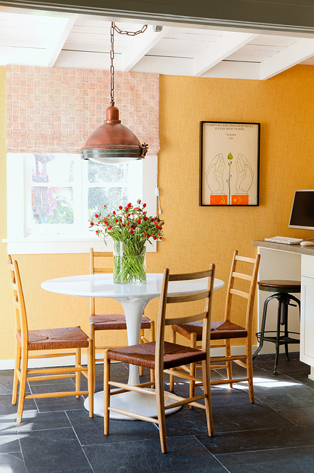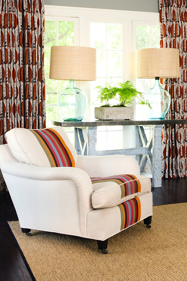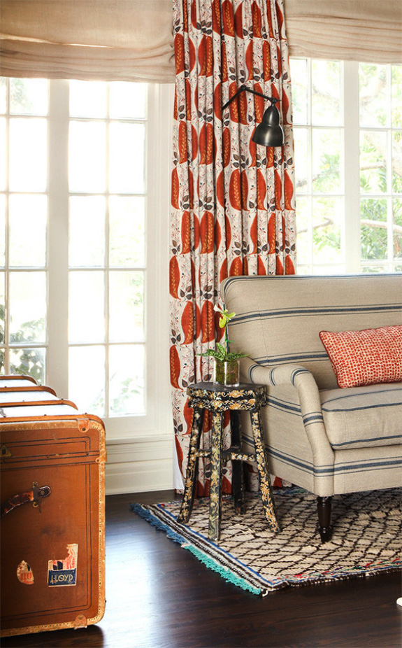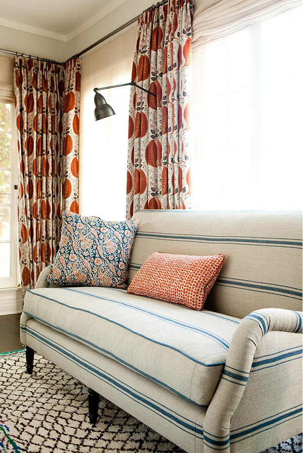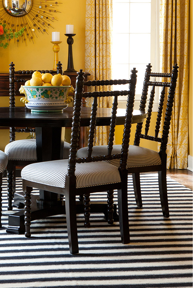 Bright yellow walls, grahic patterned curtains and stripes add some pretty bold and playful touches to this other wise fairly traditional home in California. Julie Goldman of J.Latter Design took things up a notch. Several notches really.