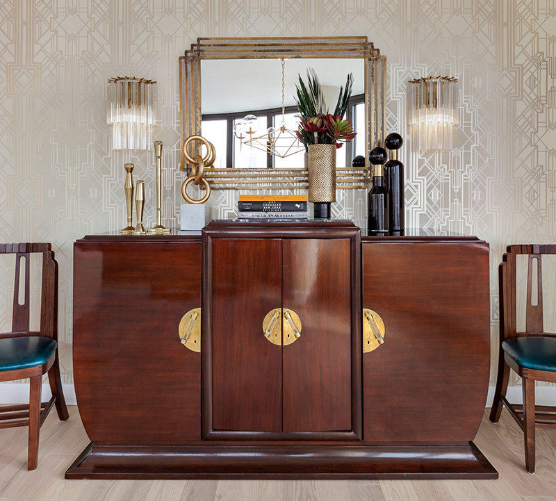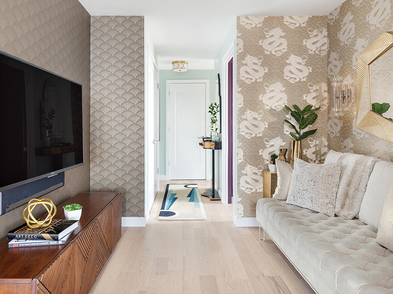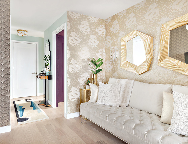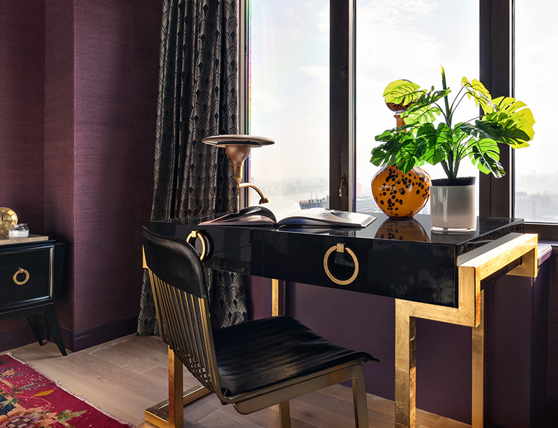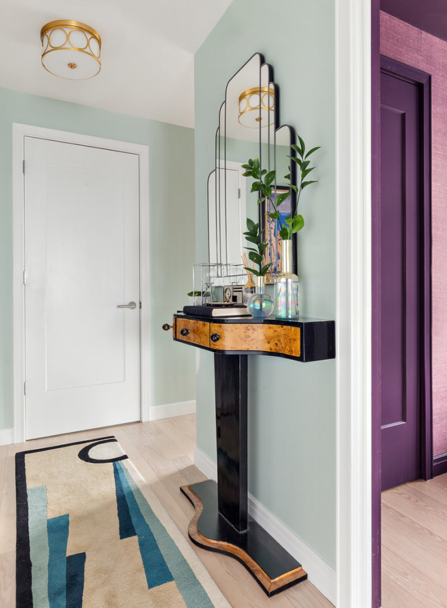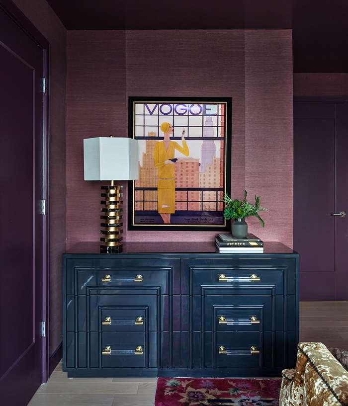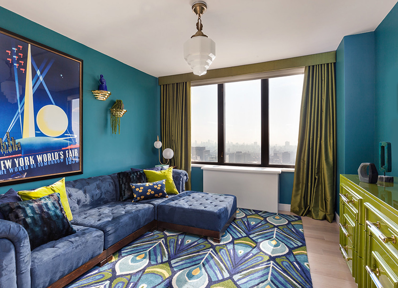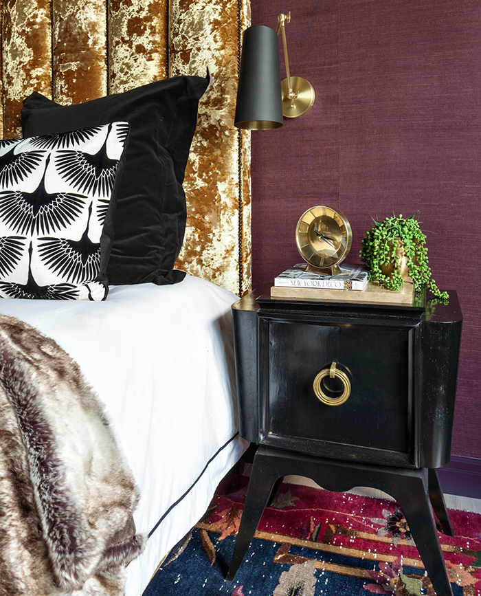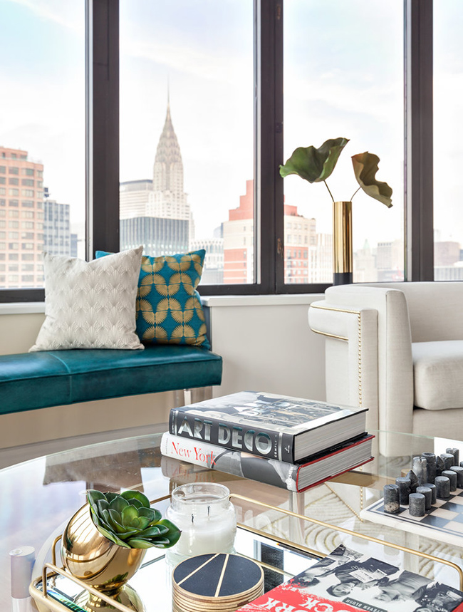 I spotted this apartment by Seattle and New York based interior designer Allison Lind and had to share because it is bold, colourful, and glamourous with a fabulously posh art deco vibe. I am completely in love with the bedroom. Helloooooo crushed velvet bed!! Gold accents throughout add sparkle, and I’m impressed that she’s combined 2 wallpapers in the small living room. Now that’s ballsy!