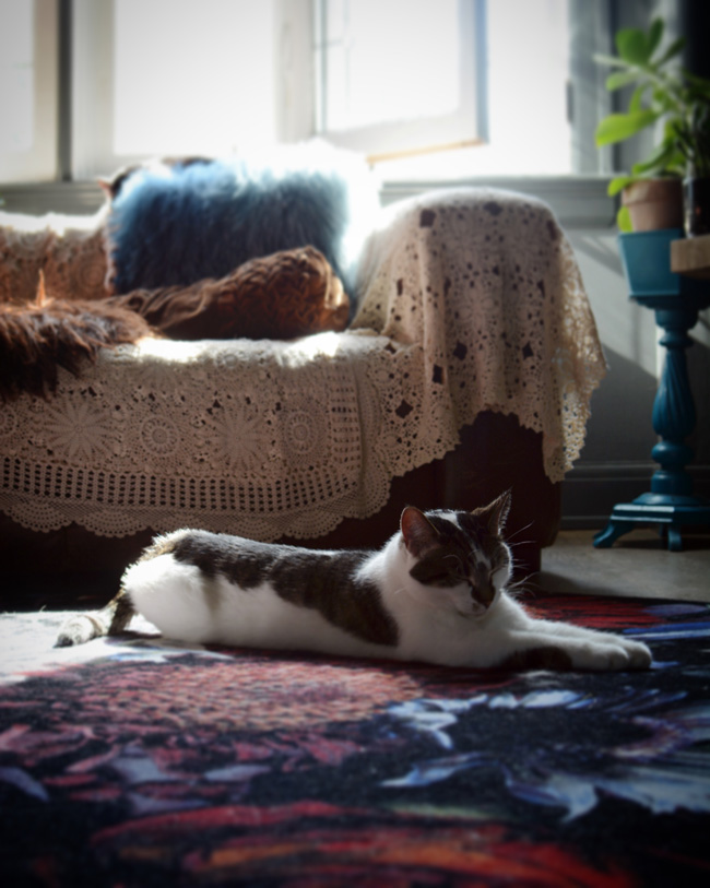 I didn’t get many photos in this week of the cats on furniture so this is all I’ve got. Feral Bernie lounging on my fur-covered Moooi carpet in the living room. And a side note: my Siamese foster Moss is doing well but I would reeeeeeally like to find him a home that is better suited to his personality (one with WAY less cats or none, and with someone home alot because he will become your shadow). Also, I visited my hair stylist’s farm on Saturday and he has a 4-6 week old kitten that was born in his barn and is destined to lead a shitty farm life and likely become feral if I don’t step in and find it a home. It is SUPER adorable and affectionate but unfortunately I didn’t manage to get a photo of it. So if anyone out there is looking to adopt a cat PLEASE contact me. I actually have dozens upon dozens of cats I can hook you up with and I guarantee I will find the perfect cat for you. π