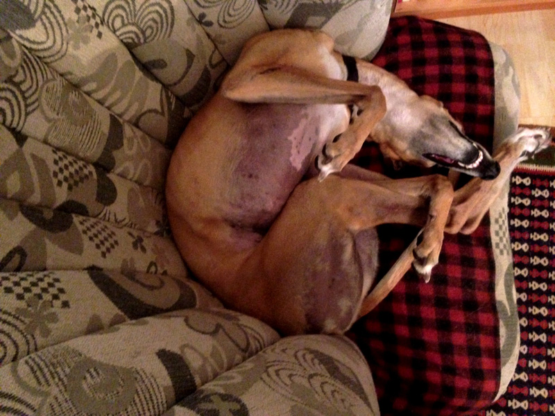 Two contrasting “poses” of my greyhound sleeping beauty, Tesla. First: on my bed. Second: hanging out on my painting studio chair