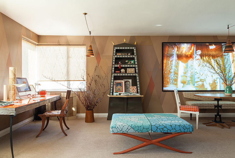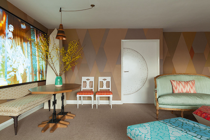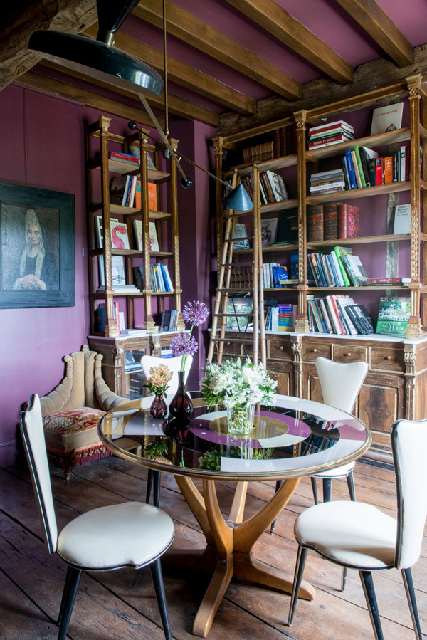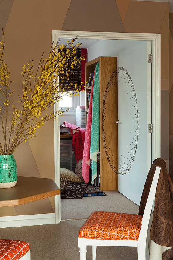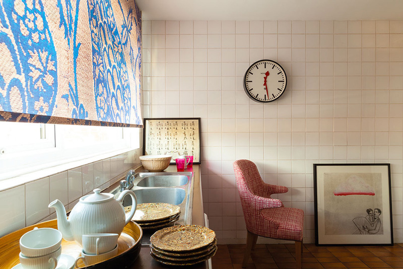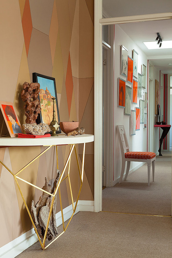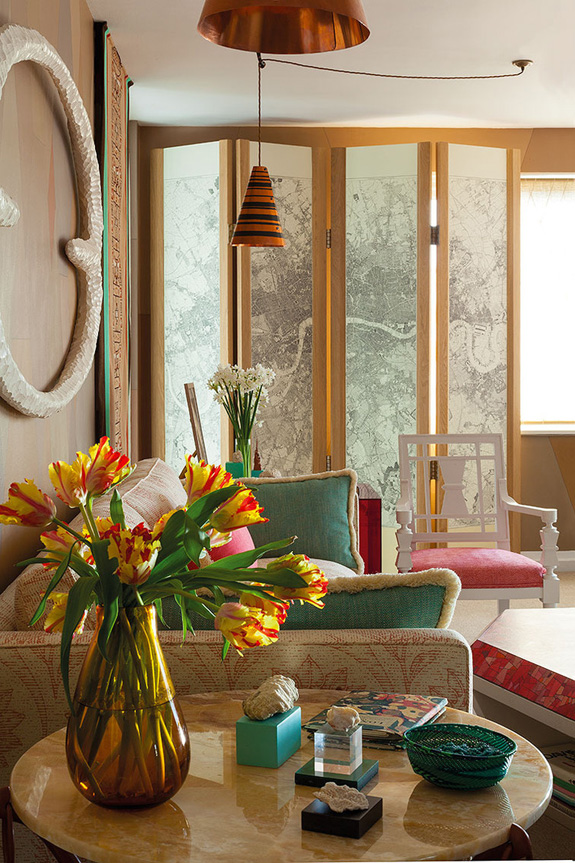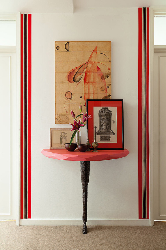 Low ceilings, beige wall-to-wall carpet, plain doors, ugly windows, a grim kitchen….living in a rental isn’t easy but designer Ashley Hicks certainly worked magic with his rental apartment. Graphic paint treatment on the walls, a photo transparency covering an ugly window, upholstery nails fancying up doors, paint details on cheap linen roller blinds, pendant lights made from copper and black paint, a handmade screen using a map of London to hide another ugly window, red vinyl and striped webbing used to spruce up a hallway, and the list goes on. Ashley may have spent a ton of time and energy transforming his apartment and customizing every square inch but the result is incredibly unique and dynamic and clearly well worth it.