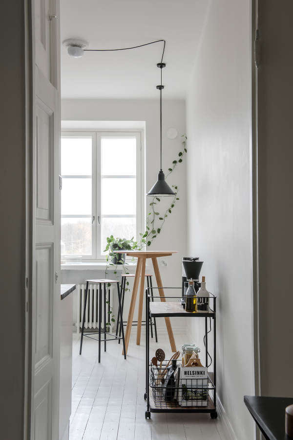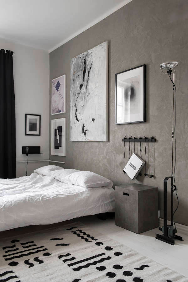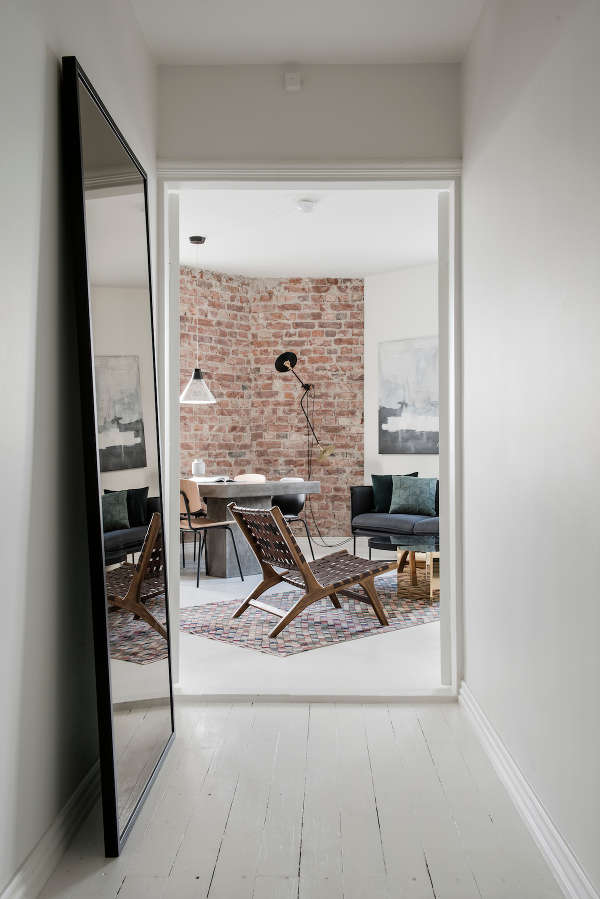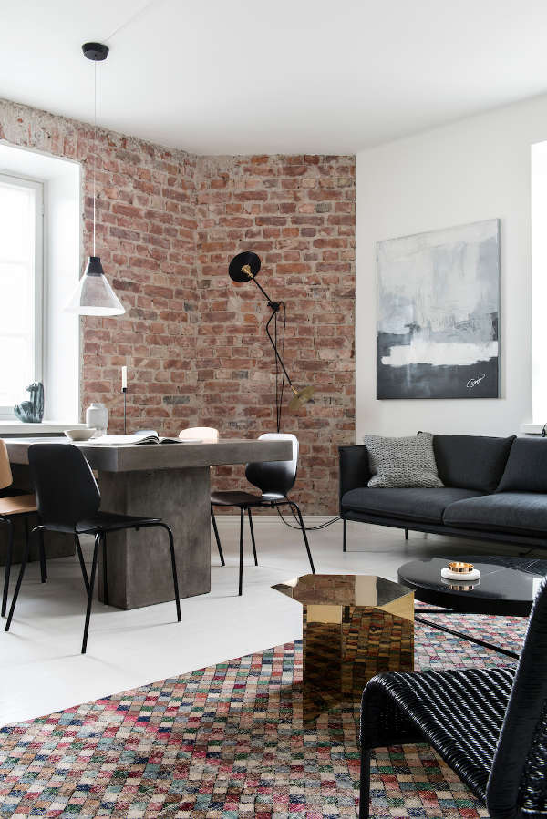 It’s Scandi monochrome done right. A stark, limited palette warmed by exposed brick accents and a rug of muted jewel colours. As for the piano! Love it. Private residence by Helsinki-based interior designer Laura SeppΓ€nen.