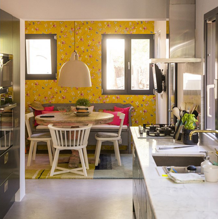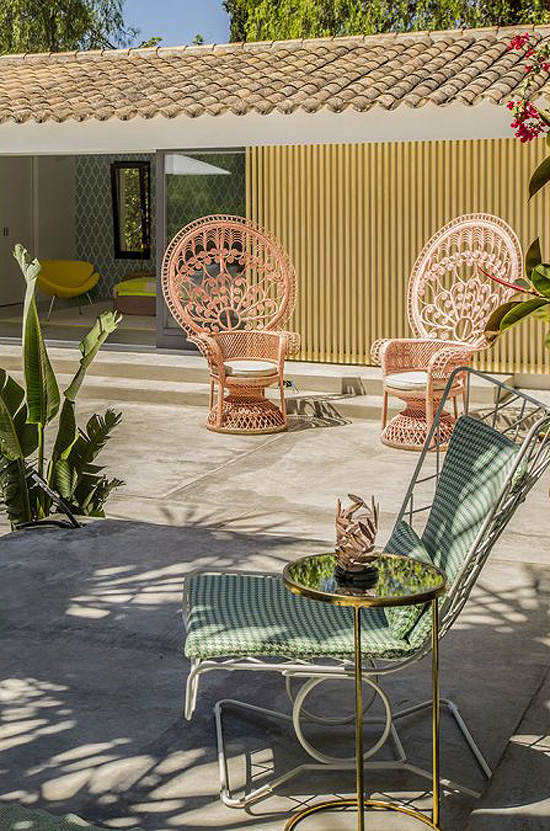 A little midcentury Palm Springs style in Bendinat, Mallorca. These colours in this climate is FABULOUS!!! I die for those fuschia dining chairs with the marble table. So good! Designed by Bconnected.