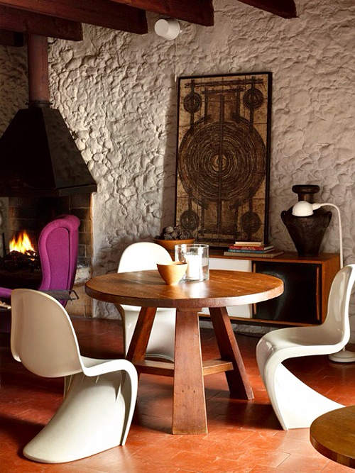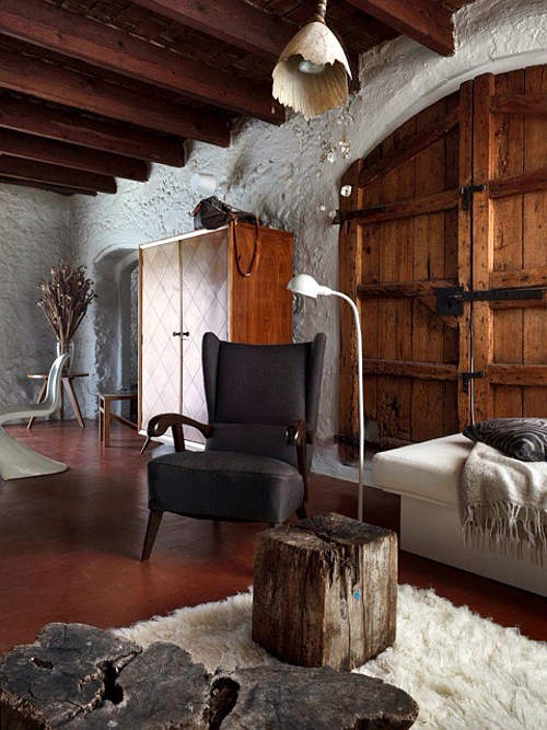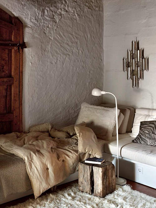 I had to share one more project from Serge Castella. A mountain shack with ancient stone walls and heavy beams filled with mid century classics and a modular sofa by a fire that is calling a siren song. “Come to me Jo. Throw your design weary bones down upon me and snuggle in those covers.” I, of course, have no resistance. I love this space.